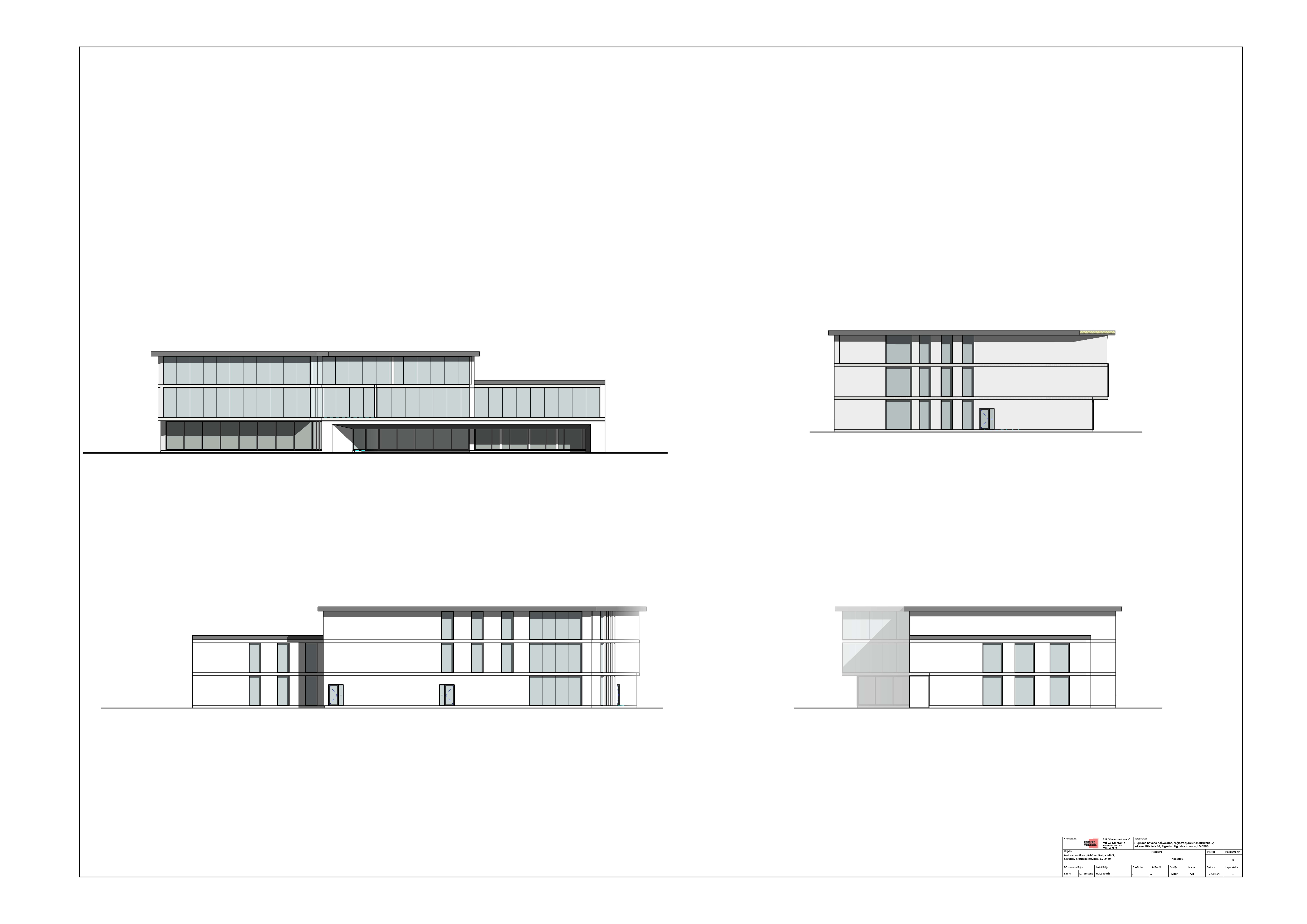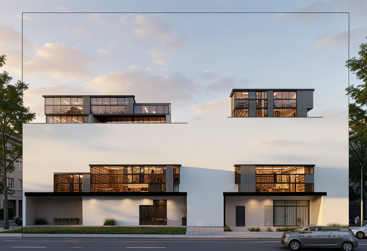 there are 4 library elevations on sheet strictly 3 floors in each elevation use the exact building geometry from the provided elevation drawings do not change glazing proportions roof slope building footprint height or window positions do not redesign or reinterpret the architecture no new volumes no additional buildings no shape modification no people realistic architectural visualization emphysize the bold black frame under 2 floor human eye level perspective street level view pedestrian point of view no aerial view no top down angle natural camera height 1 6 1 7 meters ground floor recessed inward clearly visible setback from upper floors strong horizontal shadow line between recessed ground floor and upper volume floating upper floors effect architectural depth and clear floor articulation darker tinted architectural glass bronze to graphite tone reflective but deep glass reduced transparency from outside high performance low iron glazing interior visible through glass clearly separated floor slabs inside multiple library levels visible simultaneously bookshelves aligned per floor reading areas tables circulation no single tall bookshelf spanning multiple floors realistic library interior layout calm intellectual atmosphere warm interior lighting contrasting with dark glass perforated metal panels and fins in grey color as facade accents rhythmic vertical composition strong contrast between metal and dark glass evening golden hour lighting soft sky subtle clouds realistic shadows emphasizing depth premium nordic european contemporary architecture professional architectural photography style ultra realistic archviz high detail cinematic but realistic