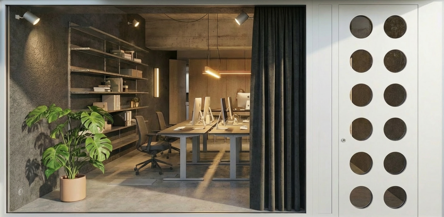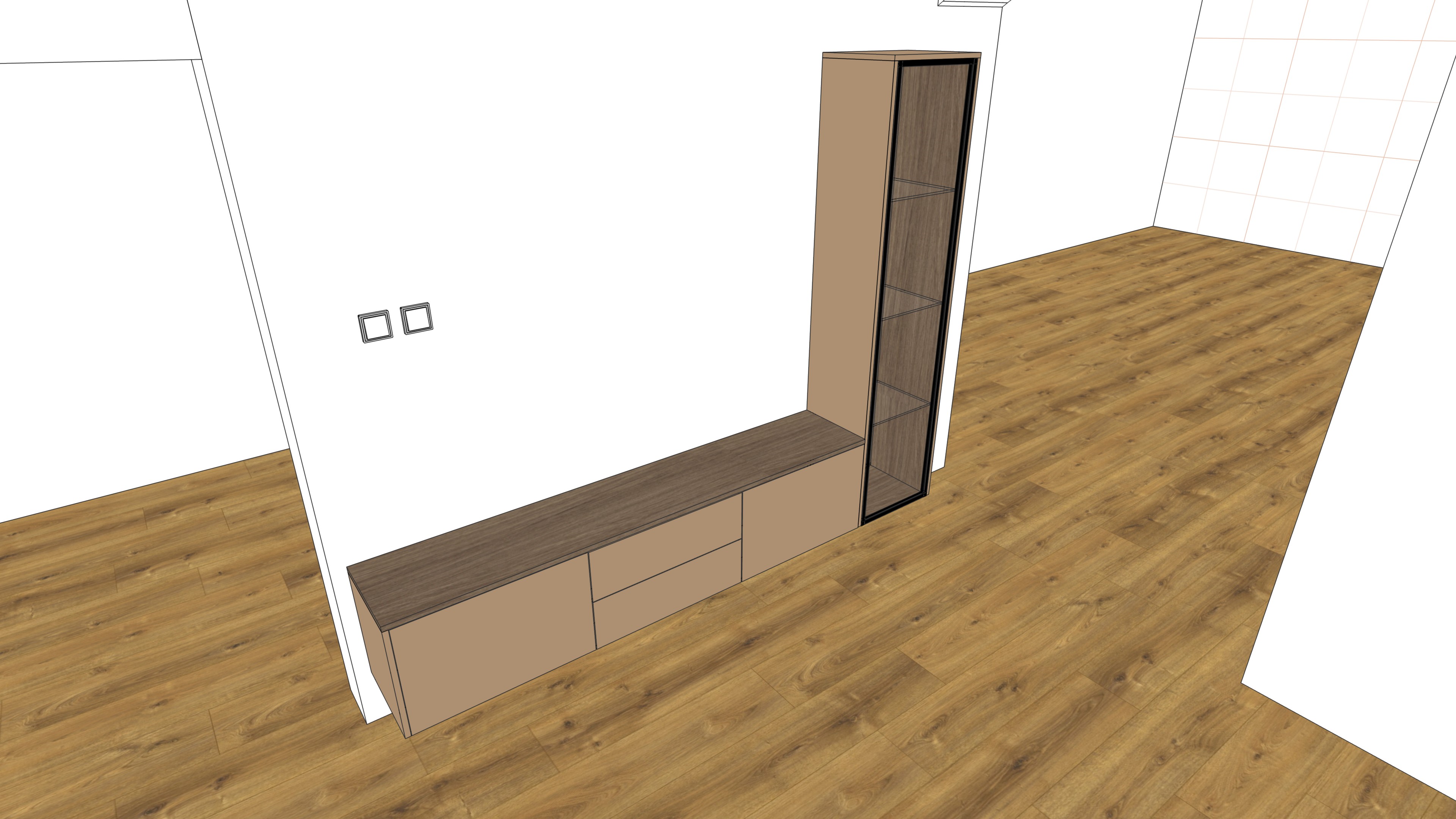 modern minimalist interior wall mounted floating cabinet with tall glass display unit egger u250 warm beige solid color neutral tone smooth matte finish no grey no green tint kronospan k696 wood on top surface and inside display cabinet darker warm wood tone rich color visible grain clear contrast between beige fronts and darker wood tall glass display cabinet with black aluminum frame clear glass shelves wood interior only warm led lighting under cabinet and vertical led inside display cabinet empty space no decorations preserve exact geometry and proportions same camera angle close view
