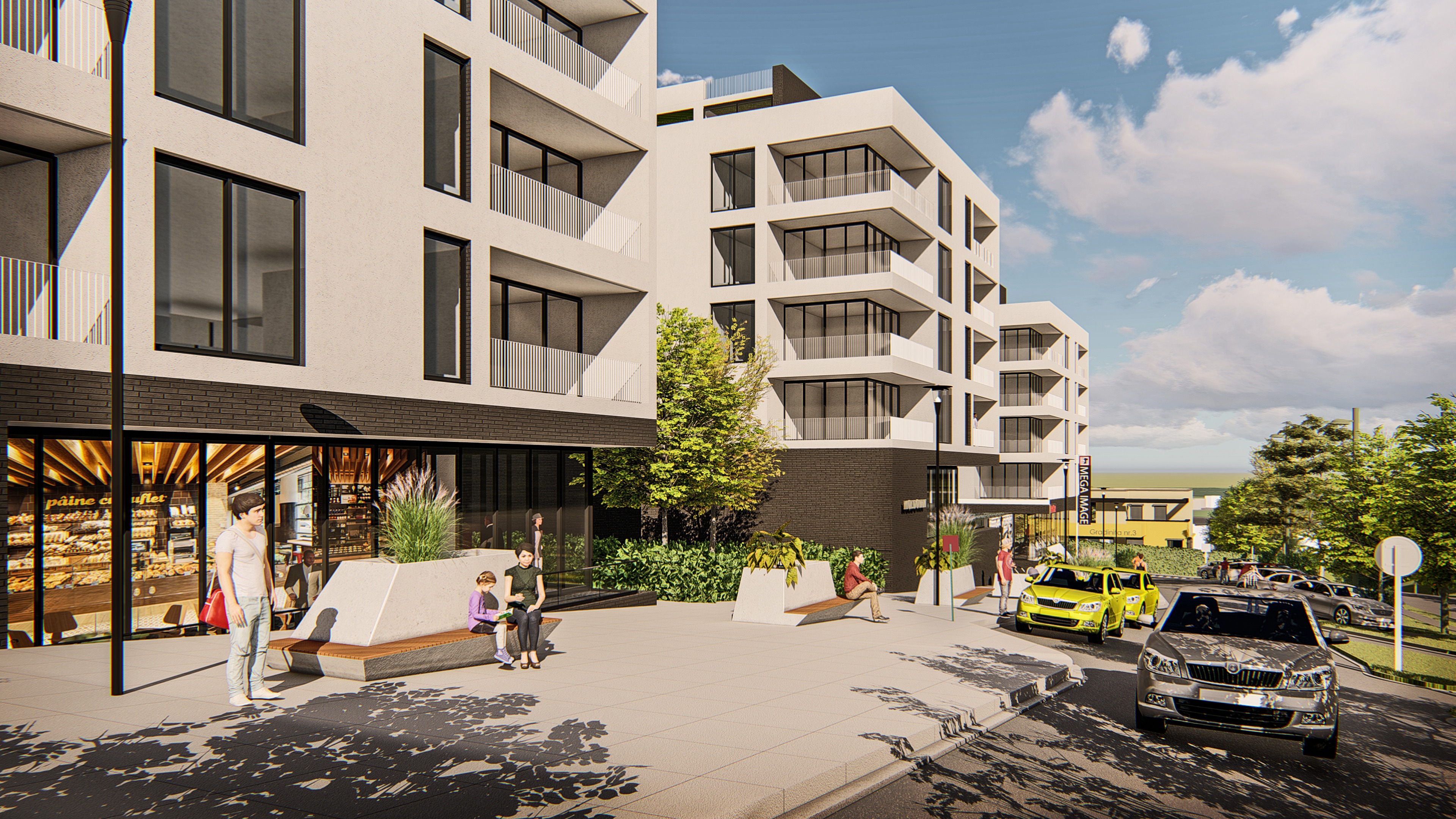 important preserve the existing geometry and the existing context exactly as provided do not modify alter reinterpret add remove scale or reshape any geometry do not change the site surroundings street layout neighboring buildings vegetation or context elements do not modify geometry scale proportions buildings road layout sidewalks or surrounding context in any way do not change text photorealistic architectural rendering clean and balanced contrast calm cinematic mood style contemporary european residential architecture minimalist premium understated include people subtle motion blur for realism do not add new people do not change the green space do not change the sidewalk do not change the road add reflection of the sorroundings to the windows
