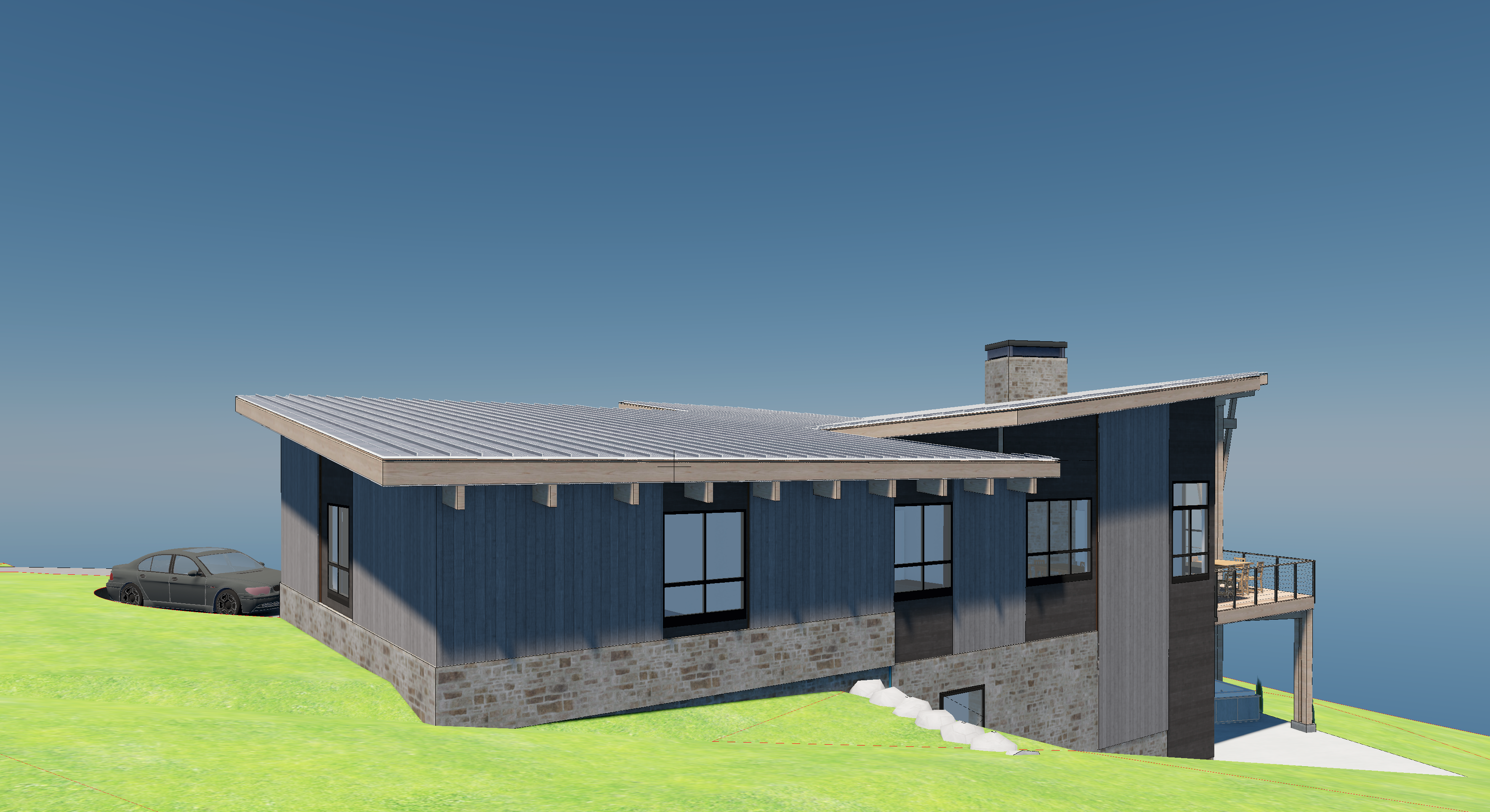 mountain modern ski home warm light emanating from the windows vertical siding in weathered wood brown areas and horizontal siding in black areas snowy pine forest around the home and distant low mountains alpine glow from behind the camera