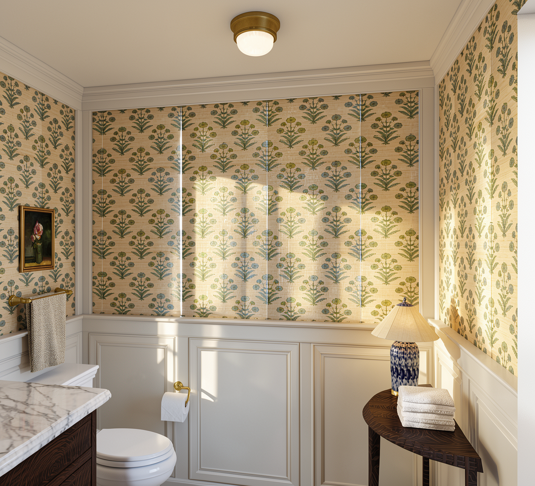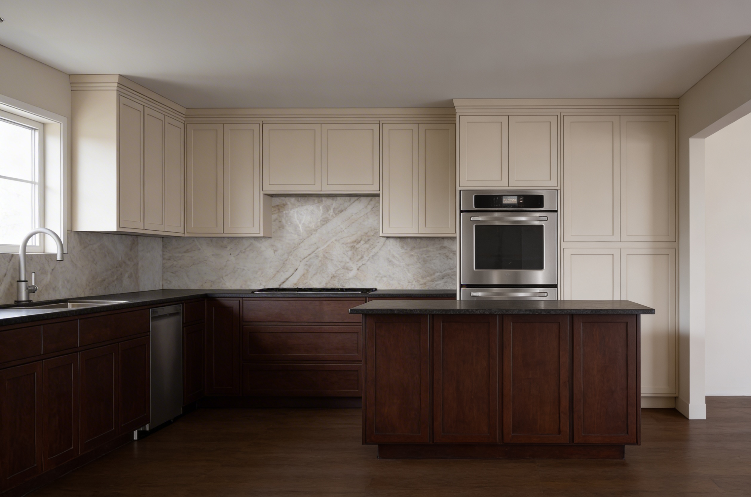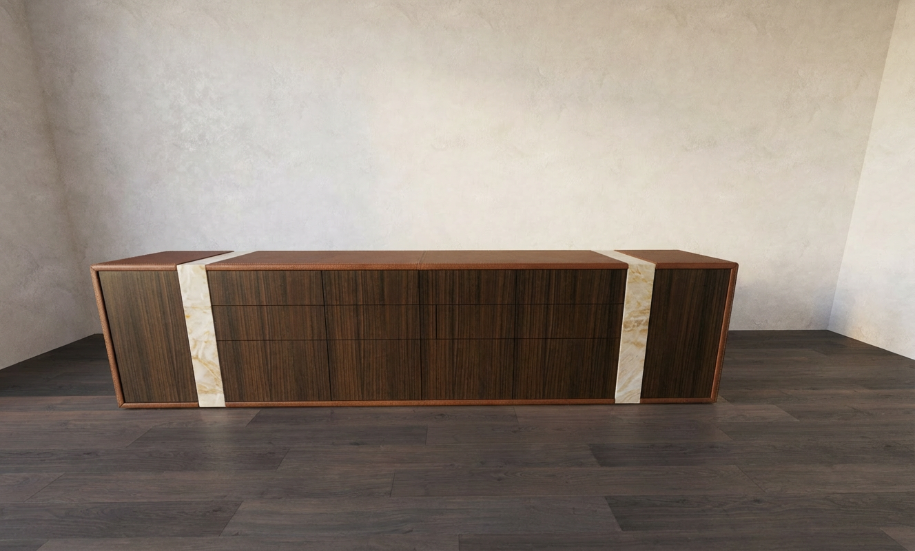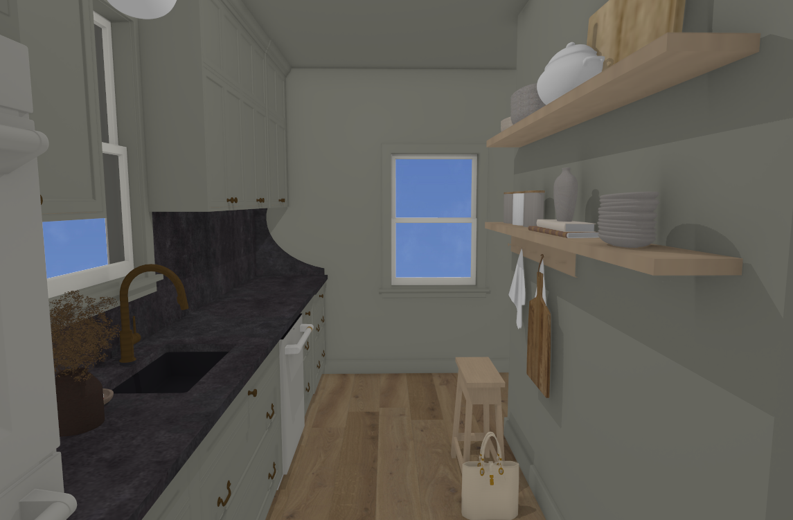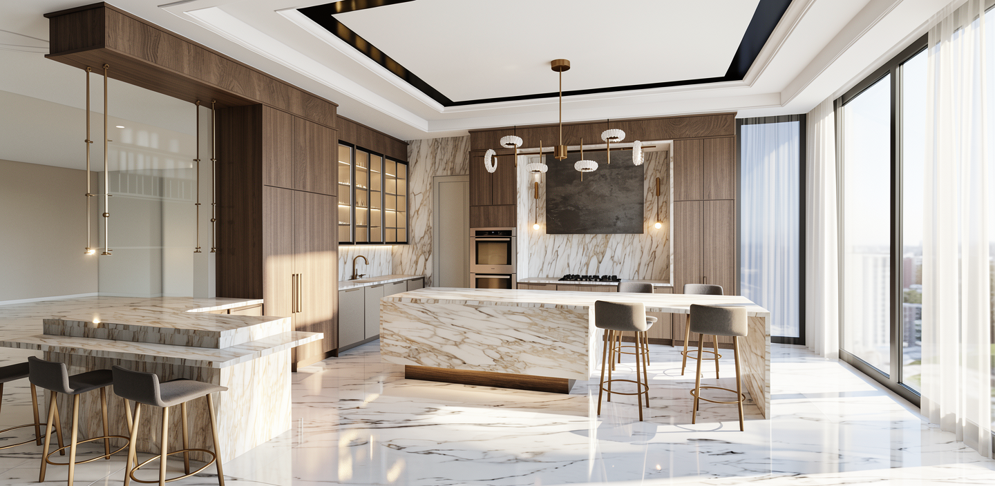 keep all colors as is and materials transform this architectural interior design drawing into a photorealistic rendering maintain the exact layout dimensions and placement of all elements do not change materials colors or geometry additionally apply a very subtle hand drawn architectural sketch overlay faint pencil line edges around furniture silhouettes cabinetry and key architectural elements as if barely sketched over the photograph keep it extremely subtle the photorealistic image must remain fully dominant