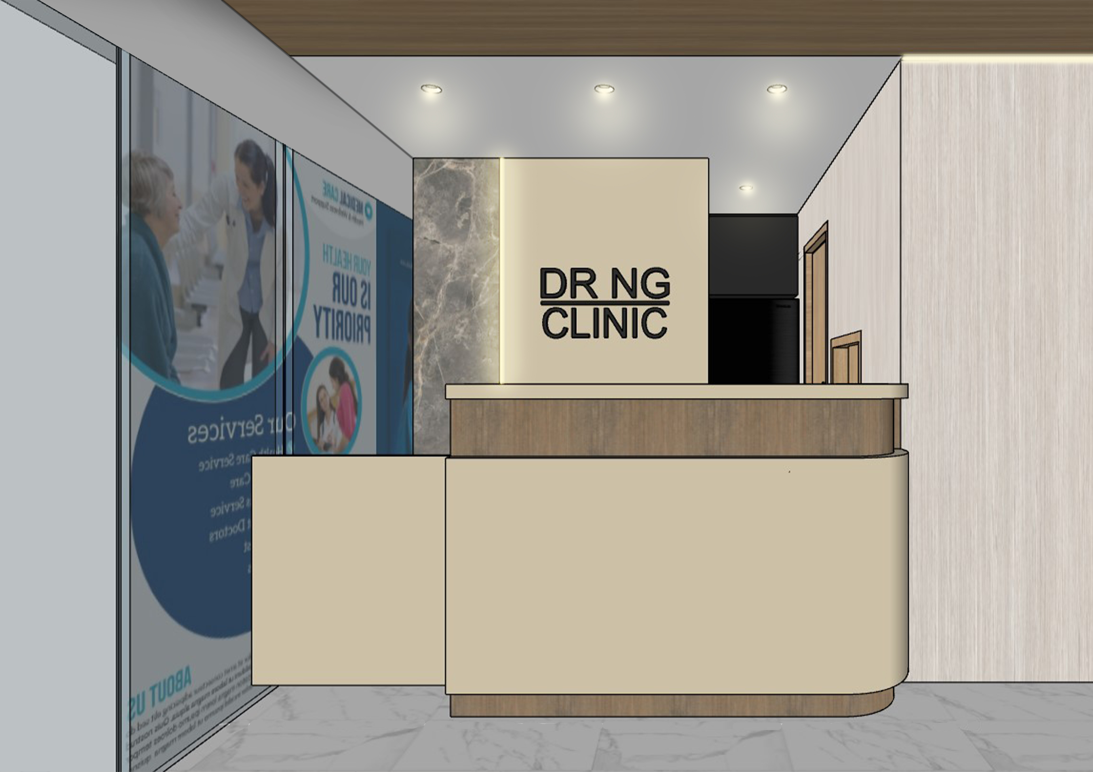 photorealistic image of well lit and clean interior of clinic maintain all materials and colours all lights in 3000k dark brown back door dr ng clinic sign backlit sunny day outside