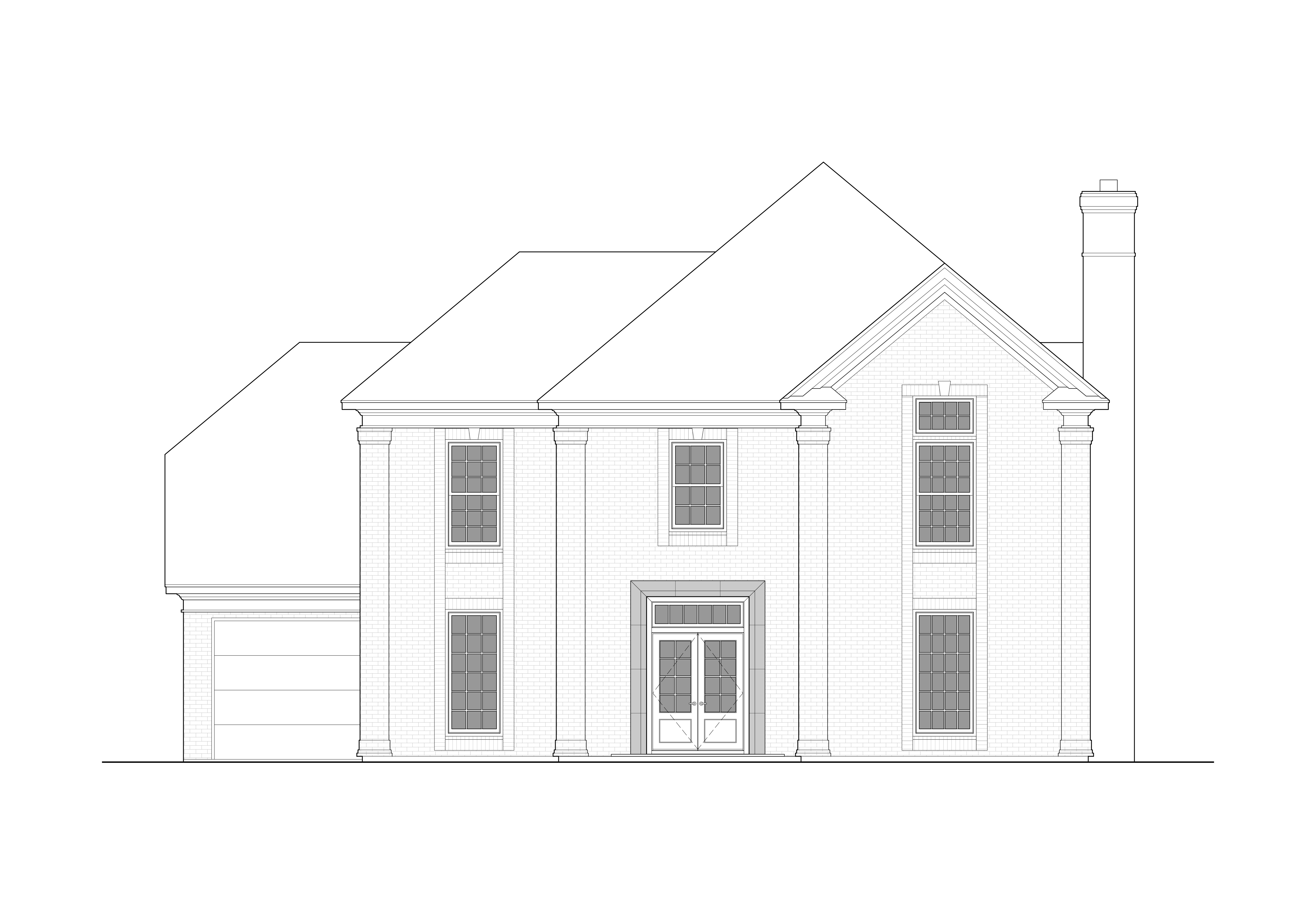 white washed brick house white painted trim dark grey asphalt shingle roof white frame windows white painted brick border around windows navy painted front doors cast stone entry surround at front door warm toned image