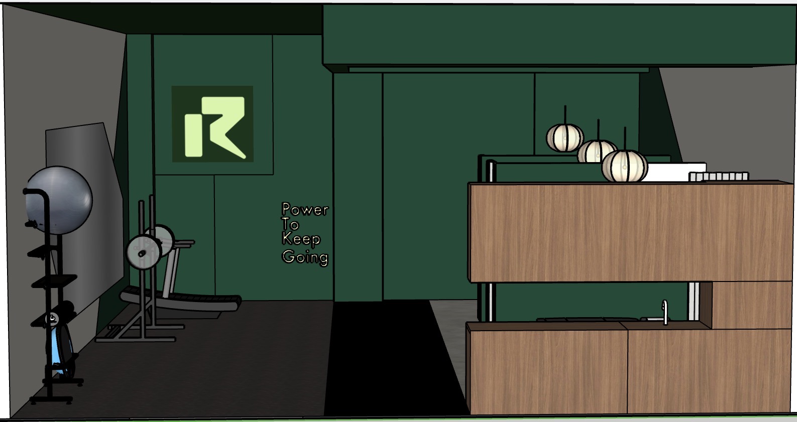 a modern gym interior with a motivational atmosphere featuring deep green walls and a matching logo with a glowing effect for the letters include a polished steel exercise ball and shelving on the left highlighted with soft shadows the floor is a dark charcoal gray rubber with a black turf strip alongside with subtle texture for a realistic appearance words power to keep going are in elegant white font giving an inspiring feeling the lighting is soft and ambient creating a calm yet energizing environment