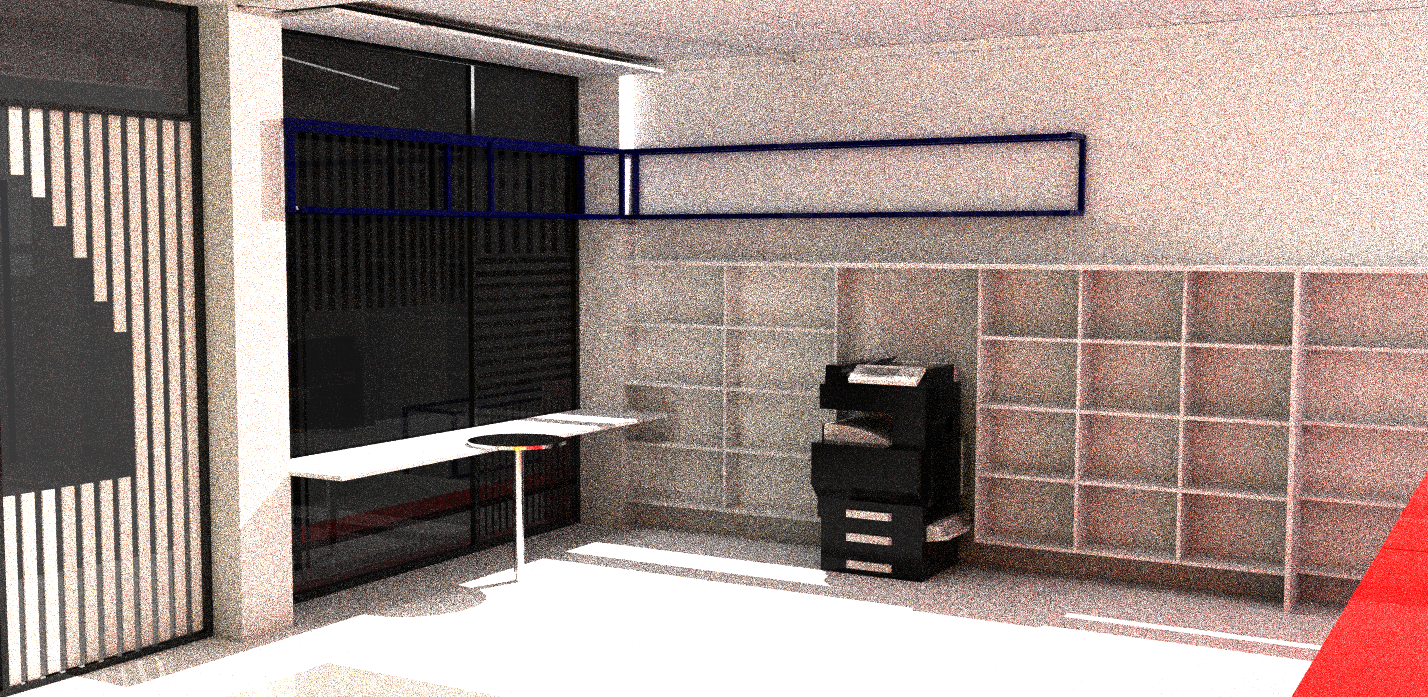 modern industrial copy centre corner special constructed furniture shelves and tables in mondrian colors red yellow blue mix of metal and mdf wood