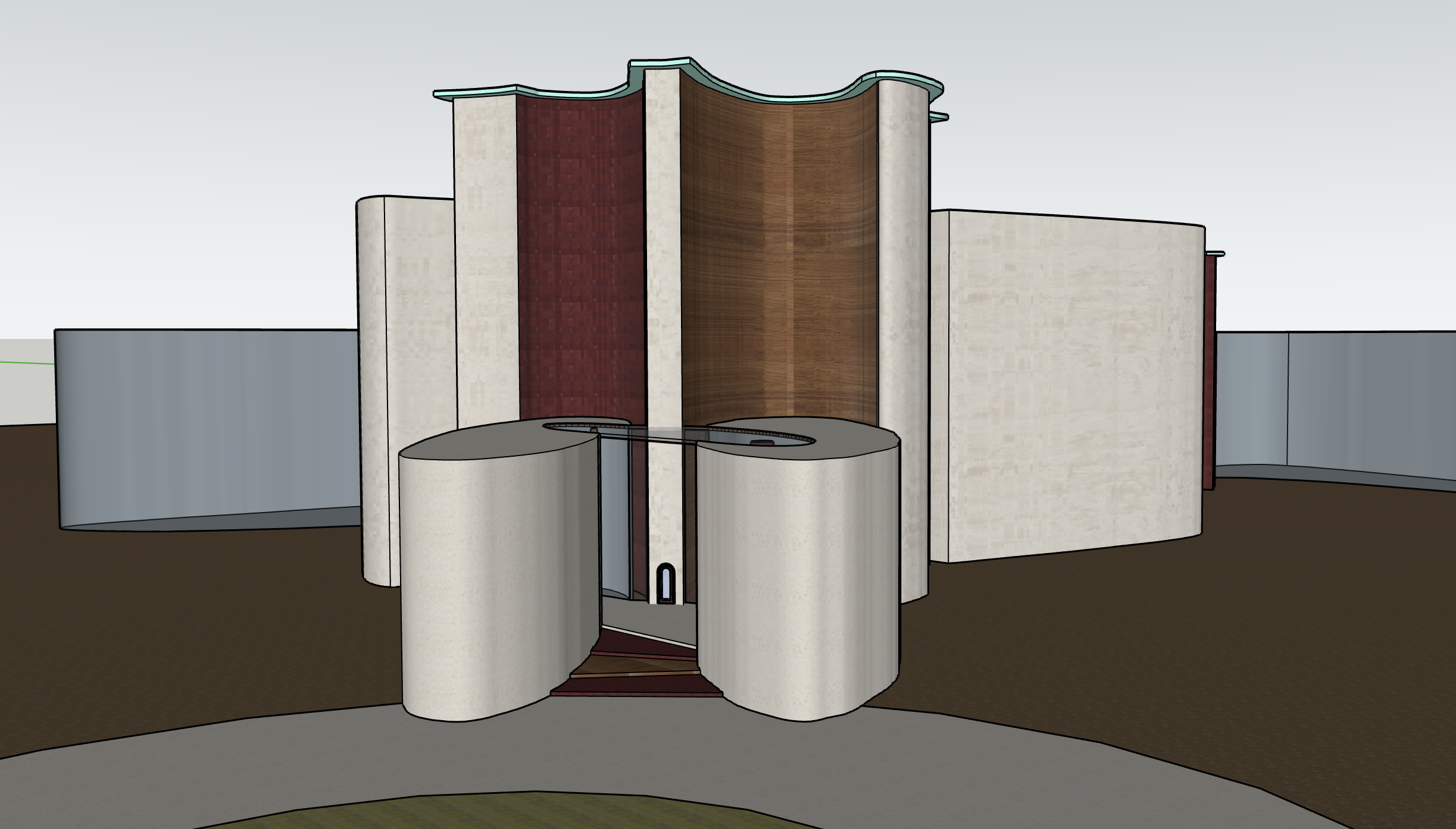 exterior modern art gallery architecture set in cancun good weather vegetation and greenery panels on far left and far right side are glass windows add people and cars on land