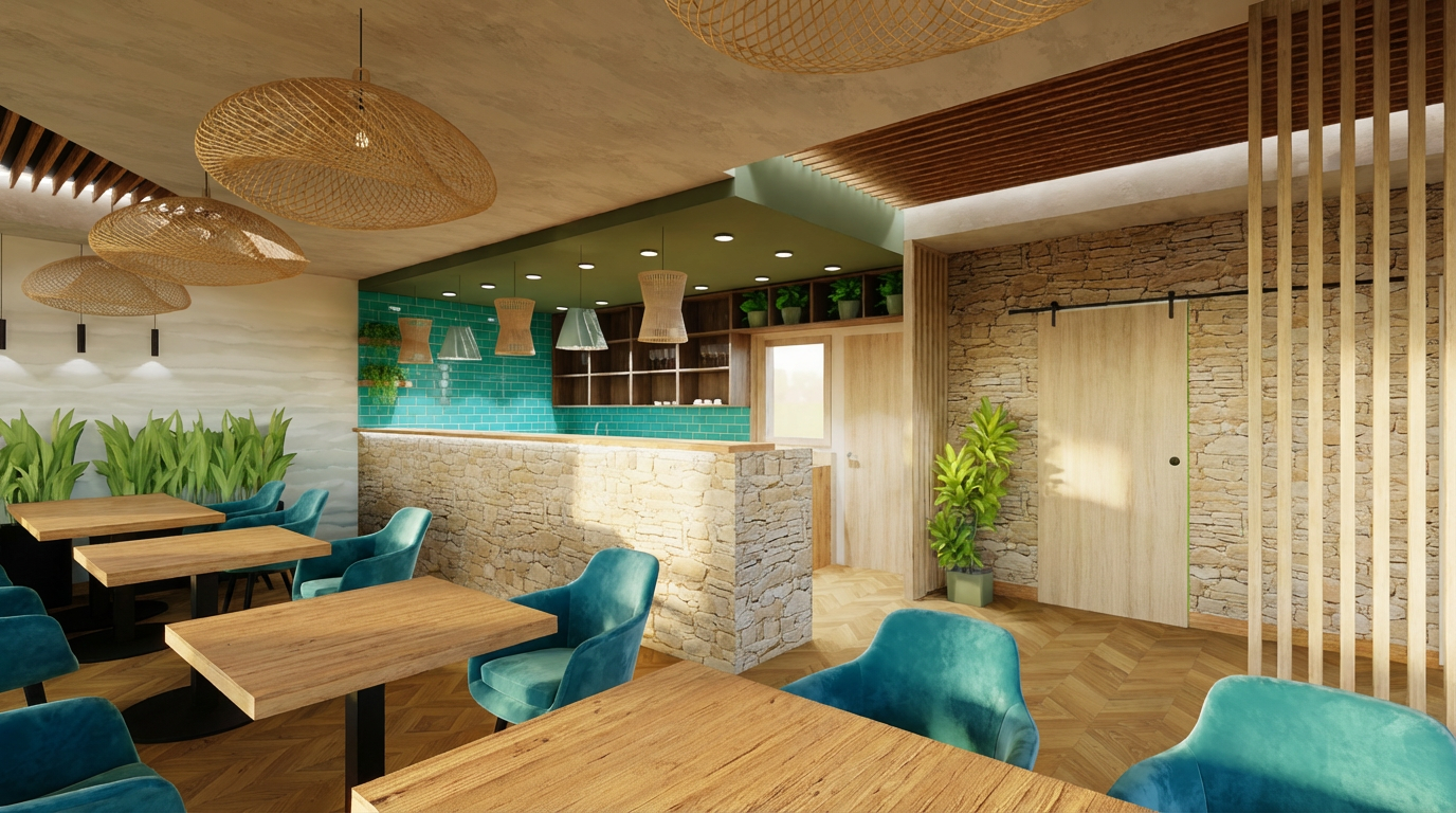 work on the lighting led following the arches behind the bar and behind the bench also work on enhancing golden lighting wabi sabi style make the wood beams more realistic texture wise make the concrete beige walls and bar look more realistic make the benches and cushions have more obvious linen volume and more realistic texture bump and do the same for cushions the tomette also very realistic on the floor make the mirror more old and collector and charming then how it looks now give the bench texture fabric a nice beige authentic linen look and same for the very pastel terracotta linen cushions put some bottles behind the bar on the shelves and some nice cocktail glasses put books wabi sabi style on shelves and for the kitchen doors smooth concrete finish with behing the two glass rounds some walls and golden lighting just to say there is a kitchen scenery back there