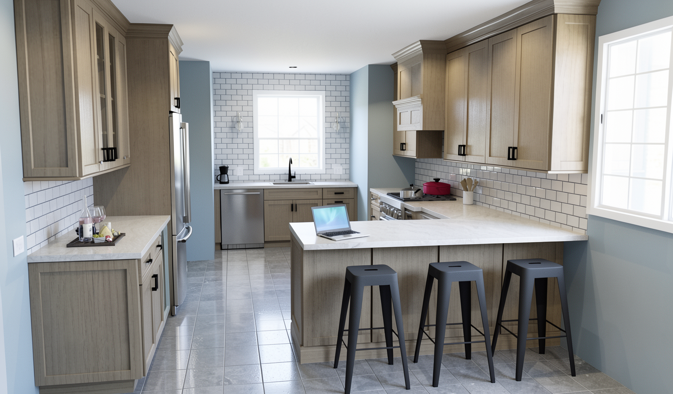 render a modern kitchen with a warm and inviting atmosphere emphasize a spacious layout with sleek rift white oak cabinetry use dark white oak wood cabinetry and stools the kitchen island top should be a light neutral color complemented by a brushed steel faucet add soft ambient lighting from recessed ceiling lights the floor should be a cool light oak finish enhancing the cozy feel incorporate minimalistic black handle details on cabinets for a contemporary touch ensure the overall mood is bright and welcoming with a balance of natural and modern elements