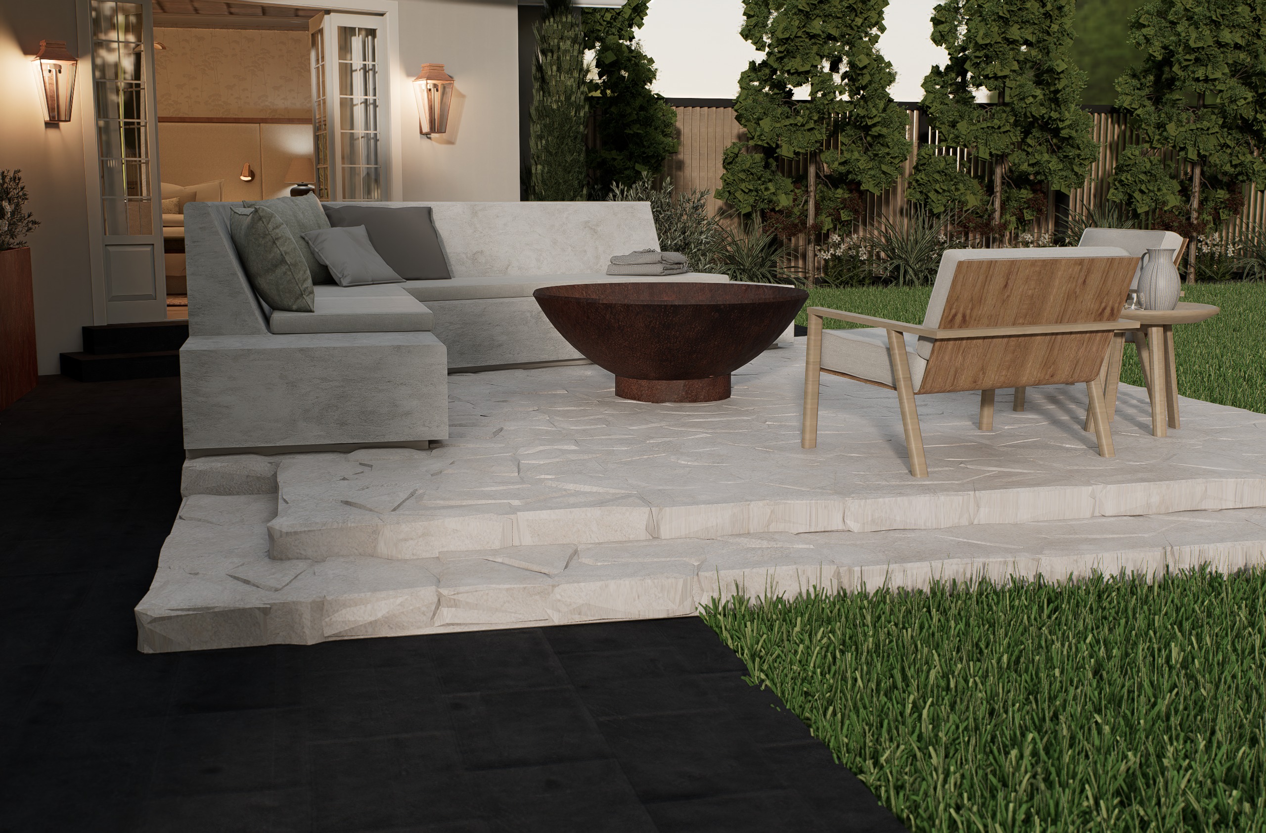 want it to look photorealistic and it also needs to be at the proper angle that will make it look like a realistic rendering not angled downwards so much the empty space behind the line of trees against the fence should not be empty but should show a cherry tree orchard the tops of the trees as you would see from the correct angle that you re standing from the rendering with leaves and cherries in bloom recommend other suggestions to it that will make the photo look more realistic also the pathway that looks black currently needs to be a tumbled blue stone and the raised platform needs to have more realistic looking tumbled cream light white colored flagstone with matching grout