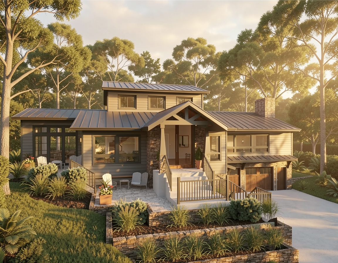 make this photorealistic park city natural landscaping board walk to the side of the house black european rain gutter on the right side of house wood planks for the siding 4k resolution keep the design the same as the sketch without making any structural changes