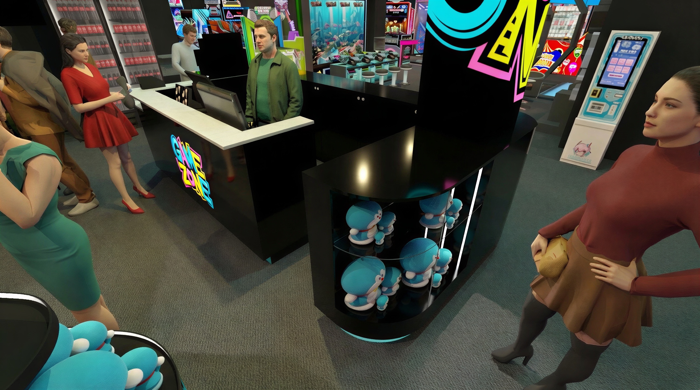 an arcade and gaming hall the machines glow brightly black walls and a black ceiling the floor covered in dark gray carpet turquoise light lines on the ceiling and turquoise lighting under the furniture create a photorealistic effect