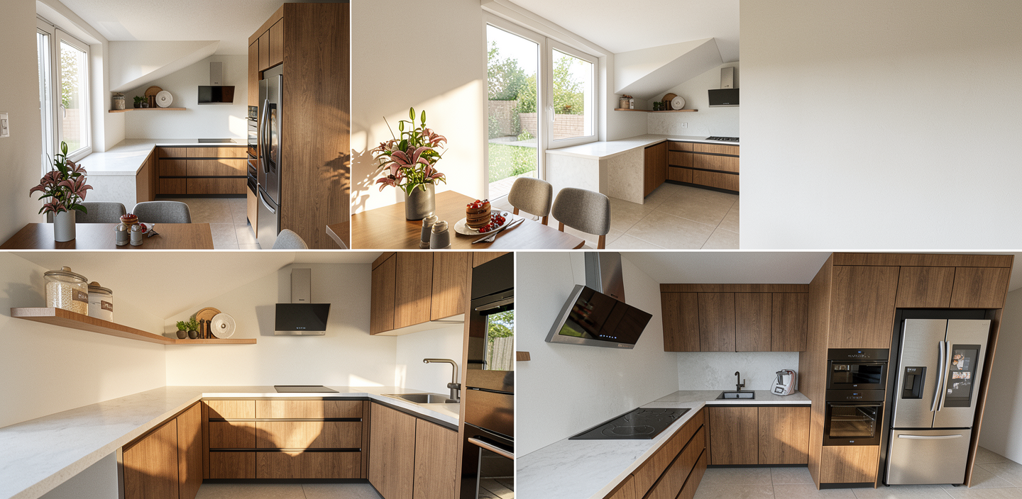 change chairs to beige curved back stools add items on shelves and worktops keep induction hob and undermount sink add pendant lights over island unit change red chairs to match colour and style of stools