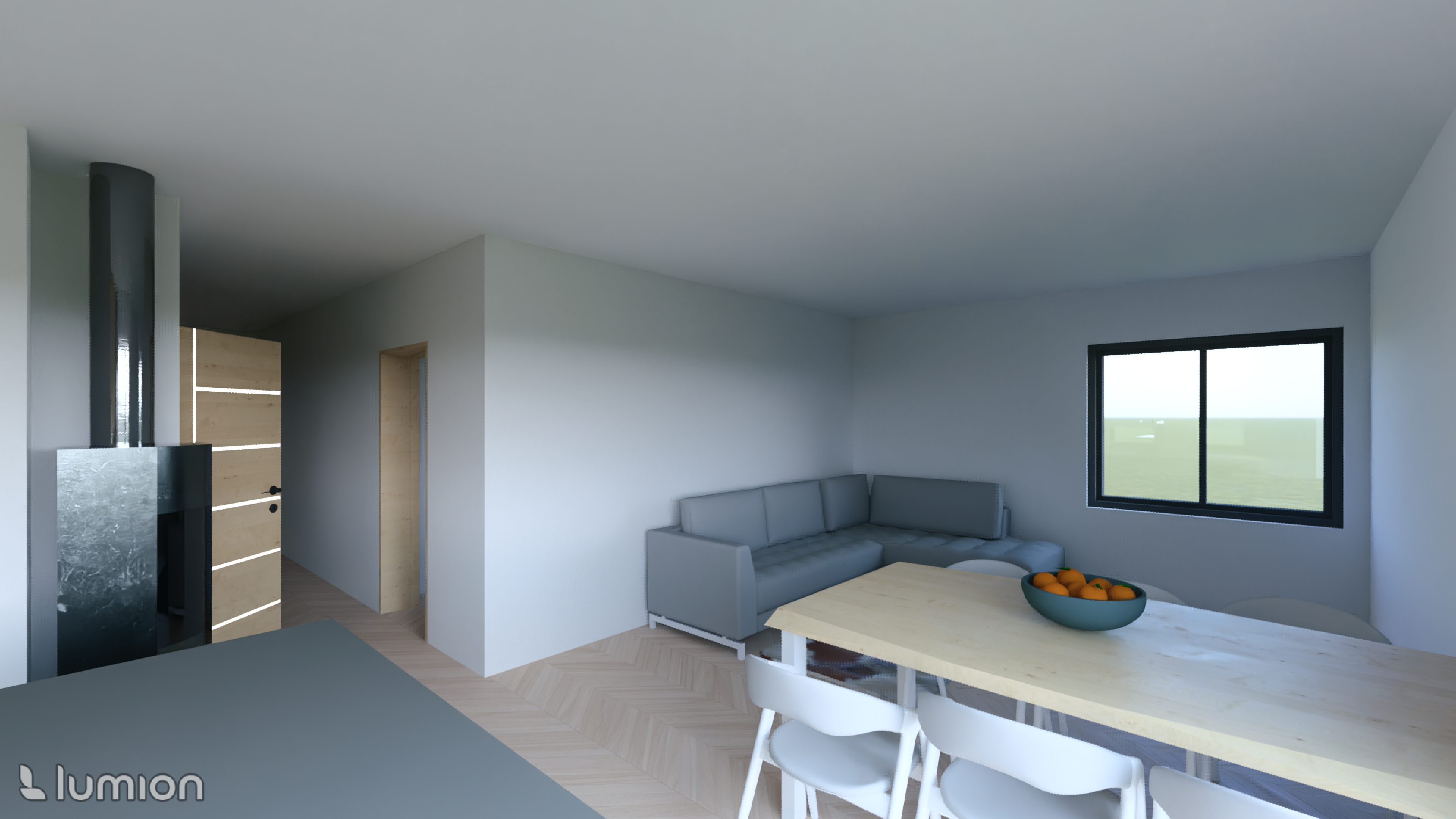 make this photo a highly realistic visualization add home accessories and place a wooden plywood painting with a bald mountain motif above the sofa