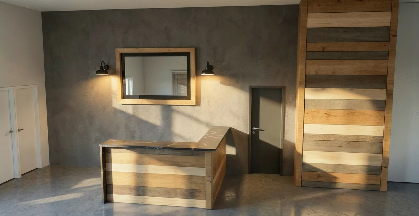the cabinets are made of dark stained alder the wood top bench is a natural stained alder with a toffee glaze cabinets go all the way to the ceiling the cabinets on top of the bench have doors the floor is an off white tile