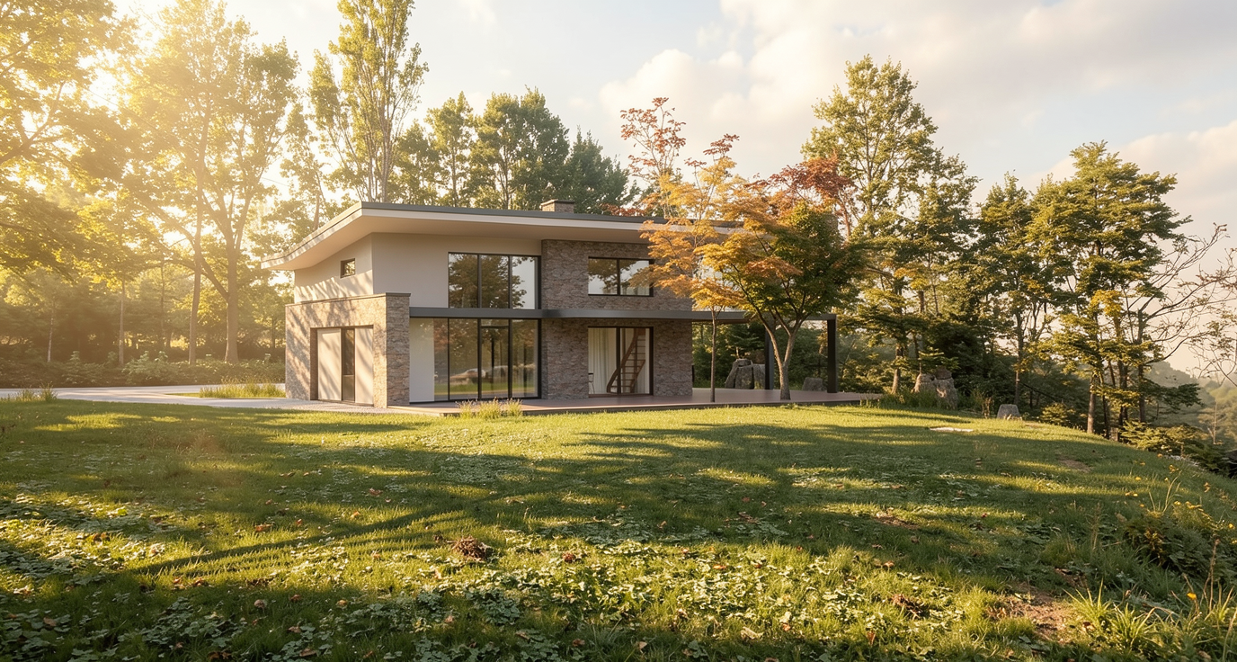 render a modern apartment complex with a sleek minimalist design the building features a combination of light gray and charcoal concrete walls highlighted with wooden details in warm oak the windows are large providing a reflective surface that mirrors the clear blue sky surround the building with lush vibrant green foliage and manicured lawns adding pops of color with blooming flowers in soft pink and red hues the sky is bright with a few scattered fluffy white clouds creating a serene and inviting atmosphere coating the scene in soft daylight capture a tranquil suburban feel with a gentle breeze rustling through the trees