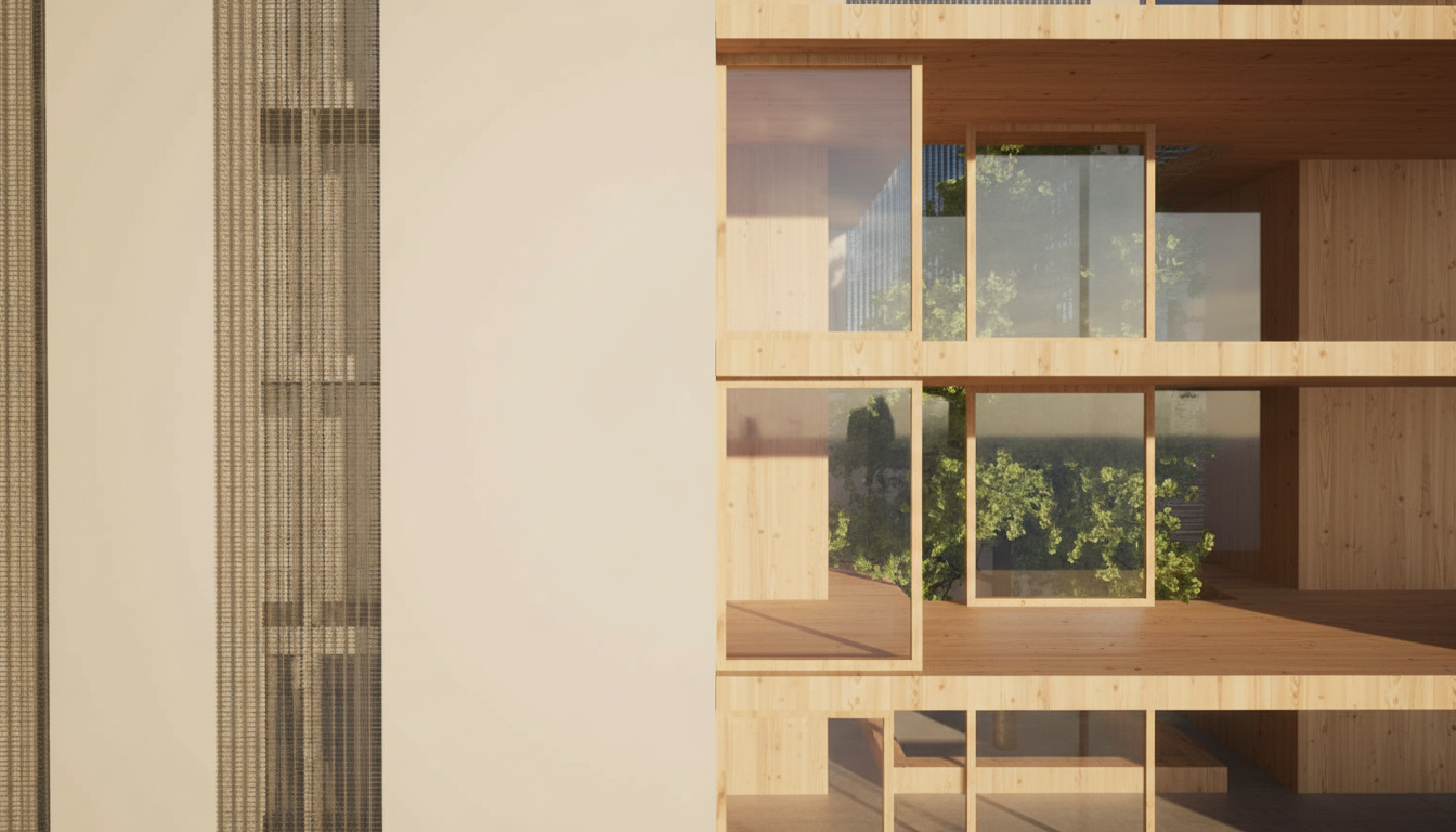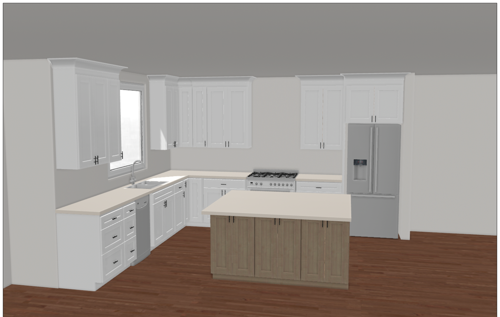 render this kitchen in a hyper realistic image with a beautiful square wood hood that matches the stain and finish of the island cabinets set the outdoor lighting as if the sun is just going down and make the pendant lights give the kitchen a nice warm feel add 3 pendant lights over the island use 6in matt black handles for all the doors and drawers all upper cabinets should go all the way to the ceiling with sub crown and cove crown on top use the reference image as a guide for the style of the hood use the reference stain sample as the color for the wood hood and island the crown should go tight to the ceiling