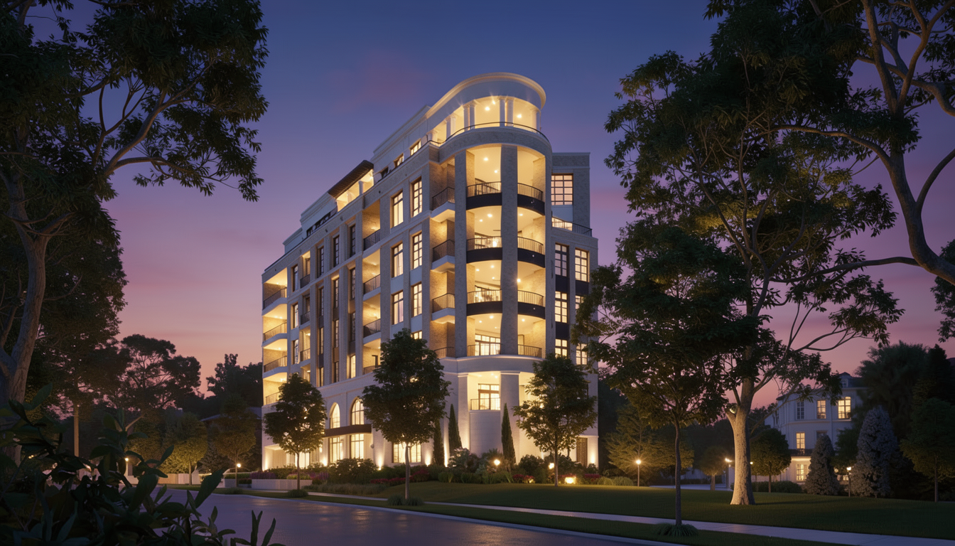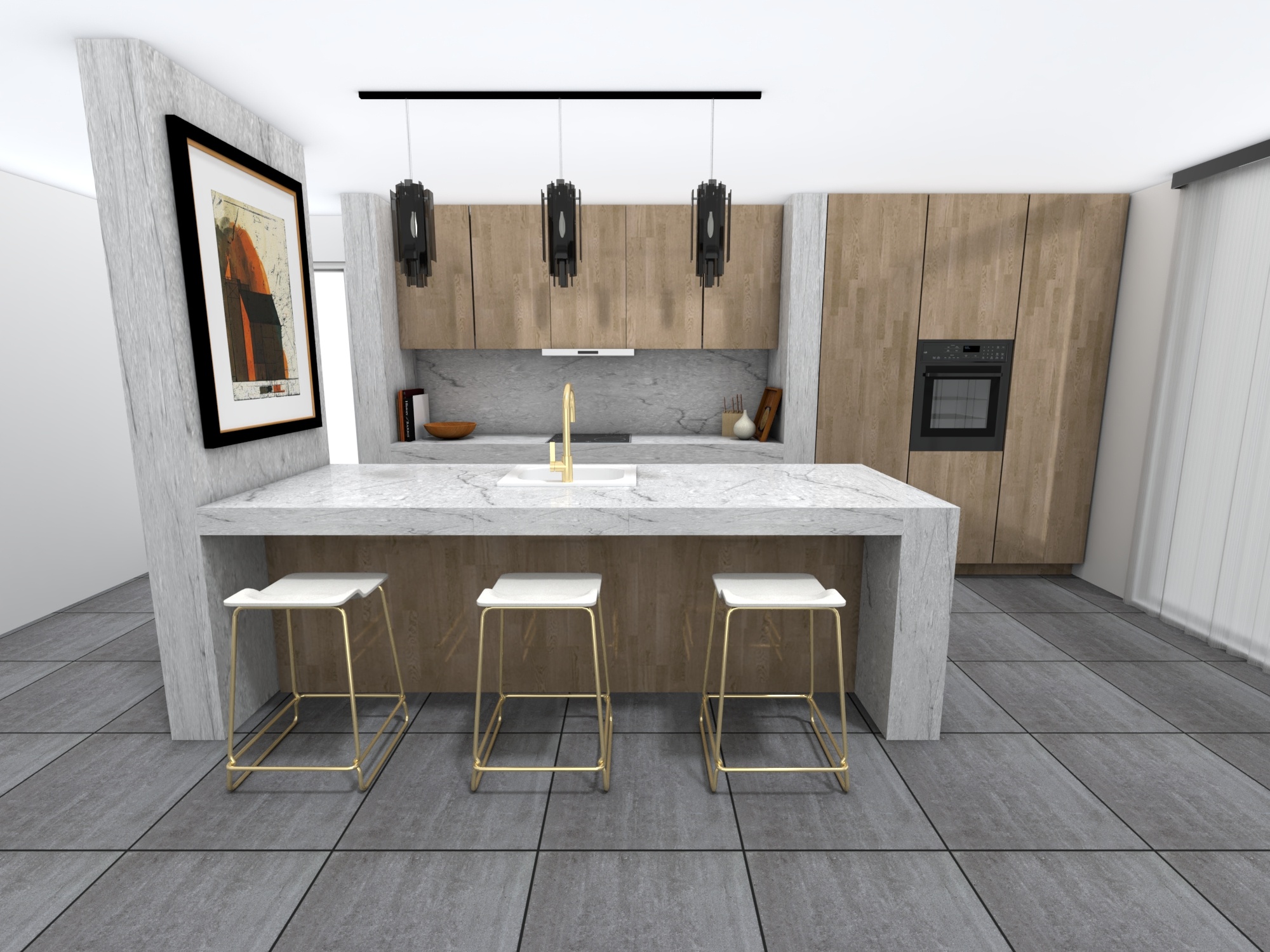 a modern kitchen with a minimalist design the central focus is a marble kitchen island with three wooden stools each with a black metal frame positioned around it the kitchen cabinetry is made from light wood and the countertops are white marble with subtle gray veining above the island there are three pendant lights with white cylindrical shades in the background open shelves hold a mix of decor plates and small items while the built in appliances including an oven are sleek and modern the floor is light hardwood and the room is bright with large windows dressed with transparent curtains architecture