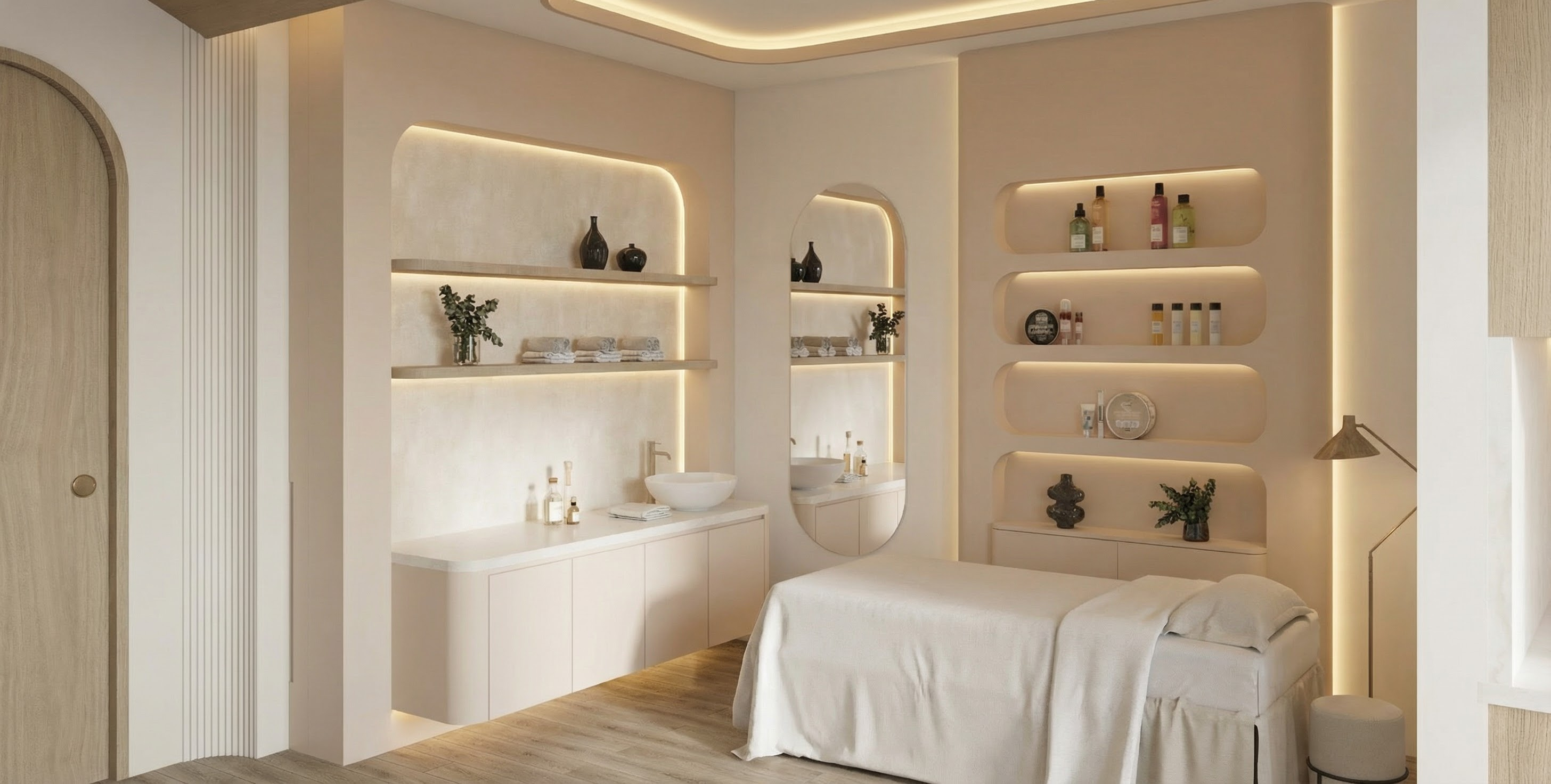 create ultra realistic images without changing any structure shape design or materials do not resize jpegs beige wood vinyl flooring plain off white walls off white ceiling white bed add indirect light and in wall is mirror white marble to table