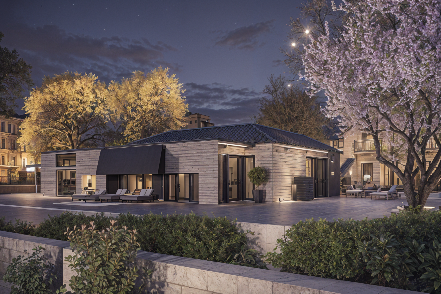 render as a craftsman style with light earth tone stone stone sill dark bronze color vertical nickel gap siding not board and batten black windows and trim dark charcoal asphalt hip style roof grass in foreground and trees in background show full elevation