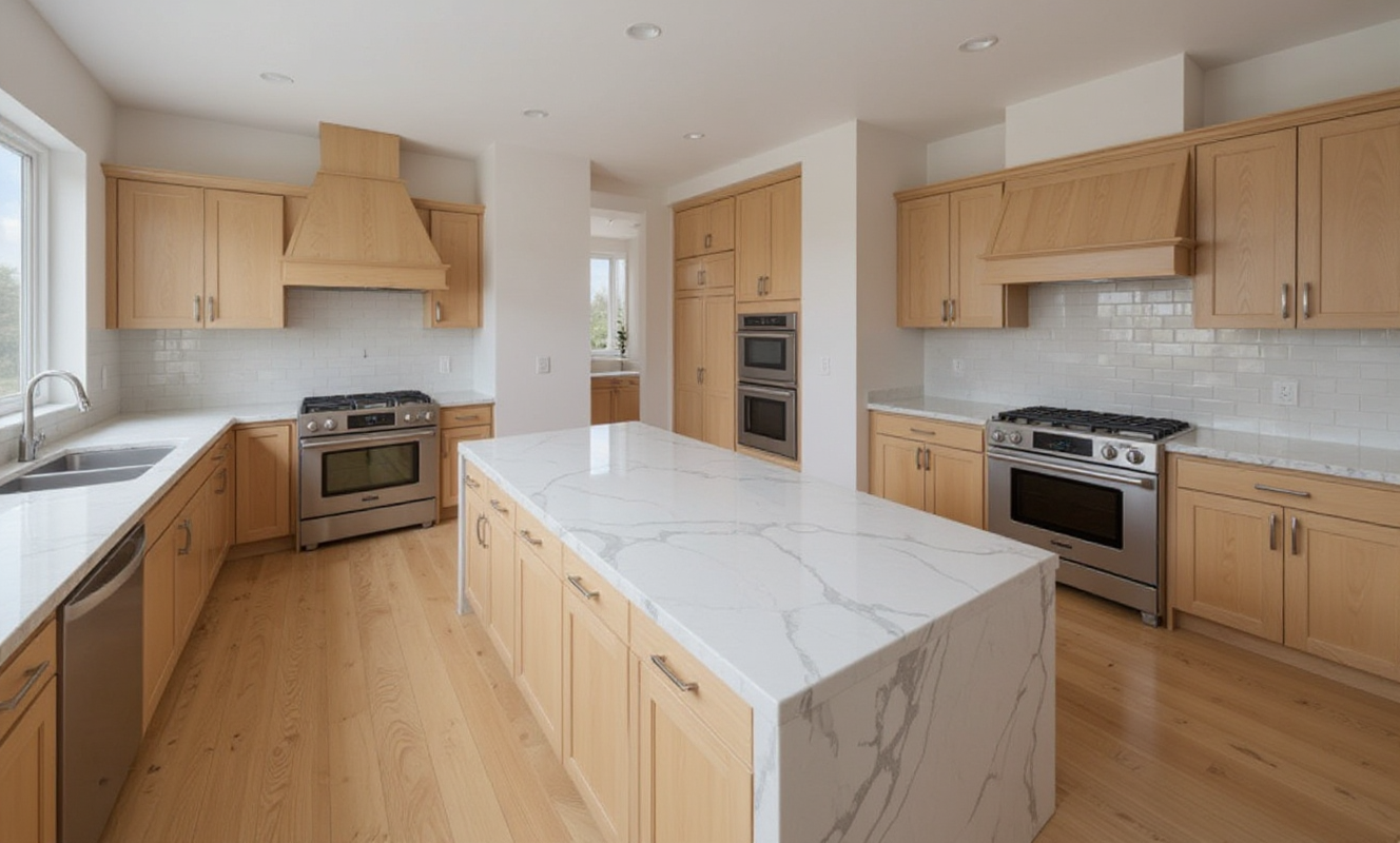 grainy watercolor render of stable building with light brown wood siding and wainscot watercolor trees and rural environment in the background extensive watercolor landscaping surrounding the building