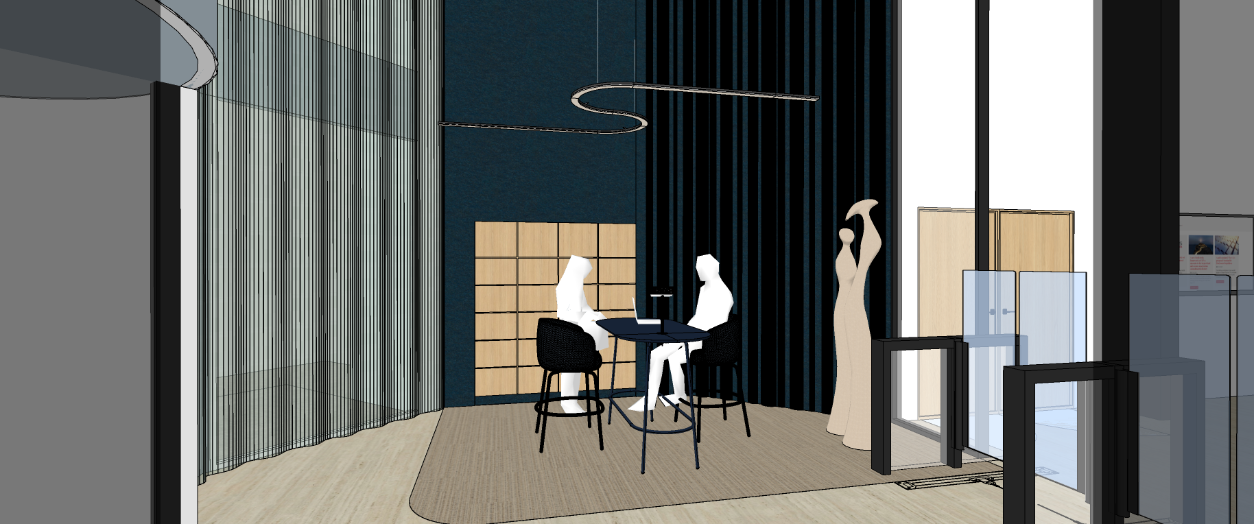modern interior with elegant minimalist design featuring a small oval black table and chairs in velvet dark blue against a deep dark blue felt accent wall creating a serene atmosphere woorden locker wall integrated natural wood finish harmonizing with the light carpet beige flooring add a sculptural beige art piece for artistic flair soft diffused lighting with a modern twist illuminates the setting highlighting the contemporary design elements