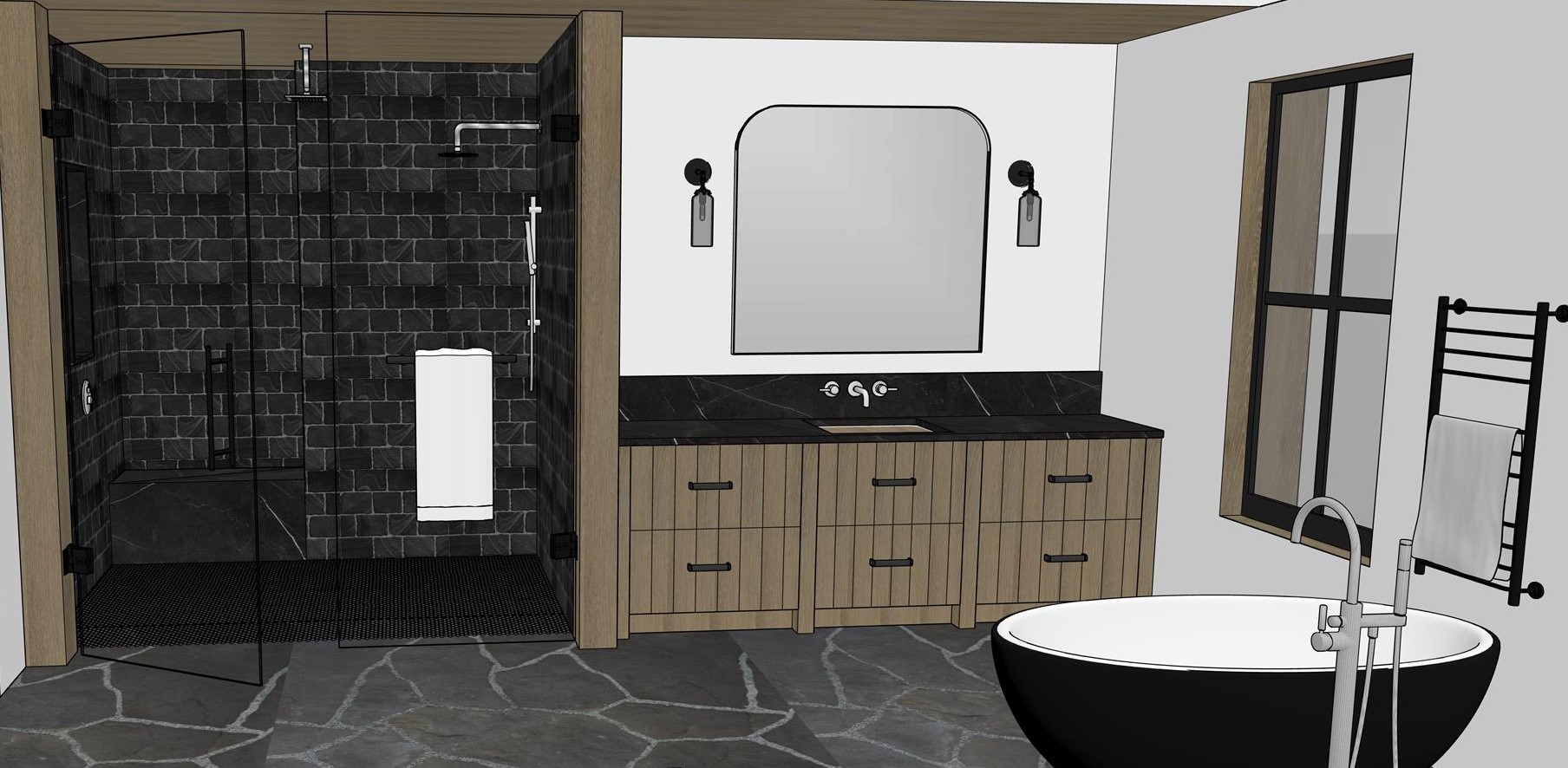 rustic flagstone slate floor add light wood shiplap walls add a light in the shower