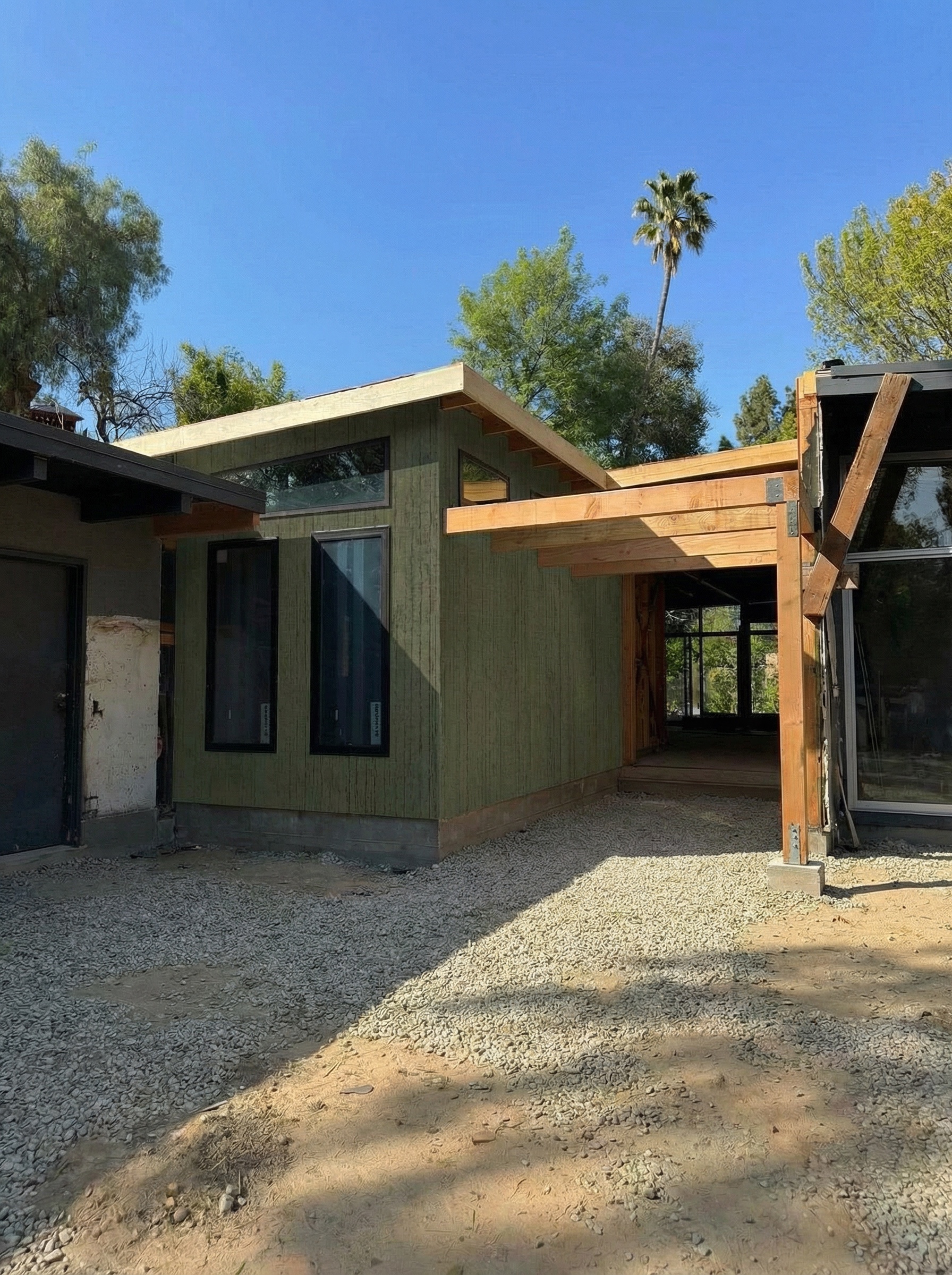 using the paint color forest floor paint the unfinished wood and any paintable surface in the reference image of the house