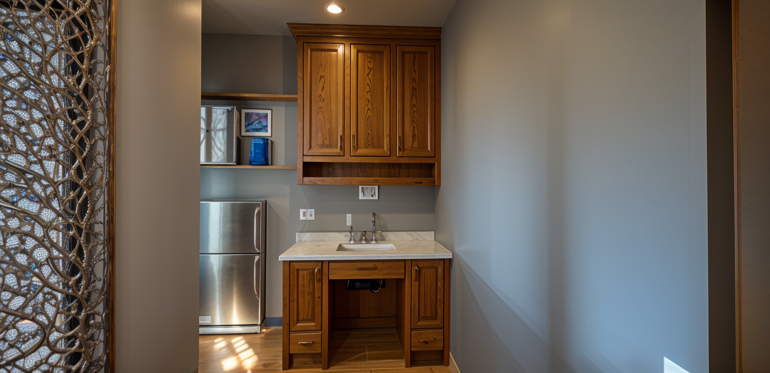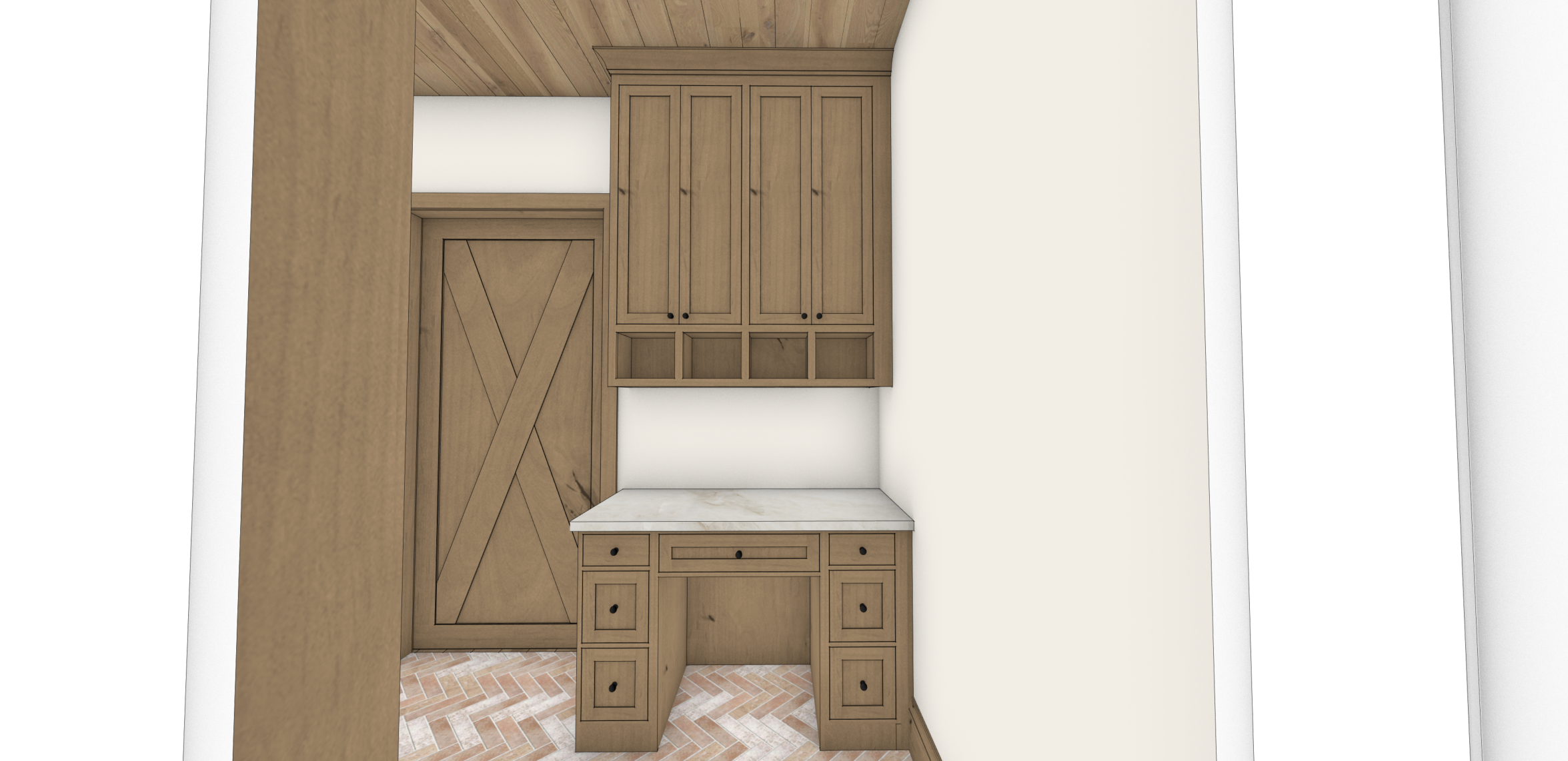 creat a 3 d realistic rendering of this in brown rustic alderwood architecture