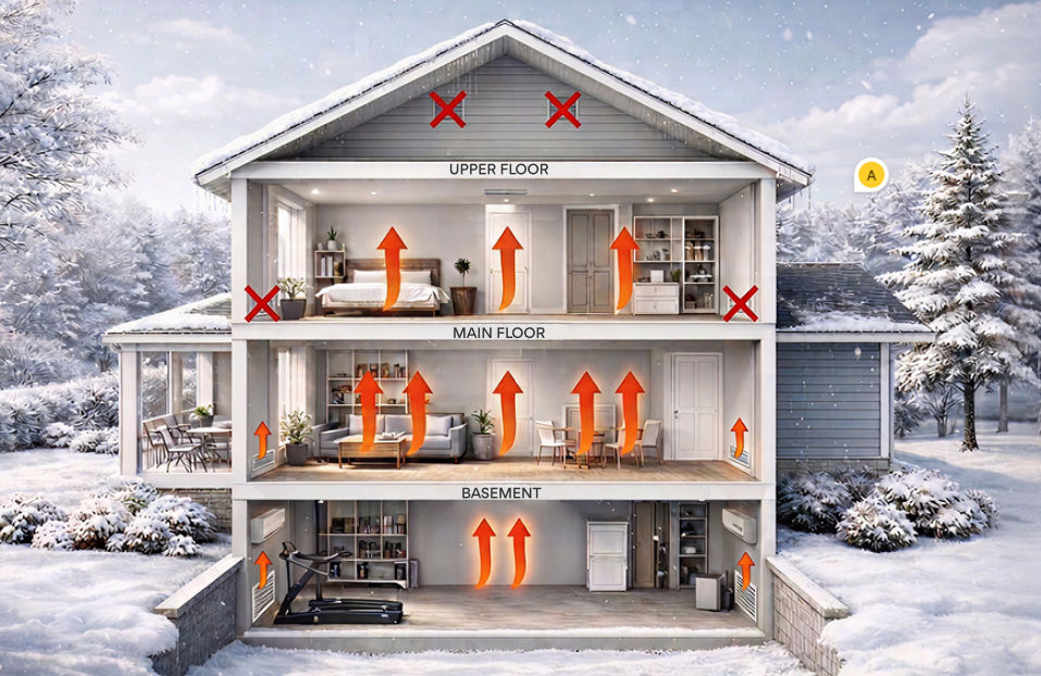 architectural cross section cutaway illustration of a three story residential home in winter setting the house is shown from the front with the facade cut away to reveal all three interior levels simultaneously exterior snow covered landscape bare and evergreen trees with snow overcast winter sky with light snowfall gray blue siding on the house exterior attached garage visible on the right side upper floor bedroom with a neatly made white bed bookshelf potted plant and a second room with open shelving and storage cabinetry neutral warm interior tones main floor open concept living and dining area living room with a gray sofa coffee table and plants dining area with chairs and table warm wood flooring throughout basement home gym utility space with a treadmill storage shelving units a white appliance freezer or washer and a mini split hvac unit on the wall photorealistic rendering style clean interior design soft warm interior lighting contrasting with cool blue winter exterior no arrows no overlays no annotations no markers