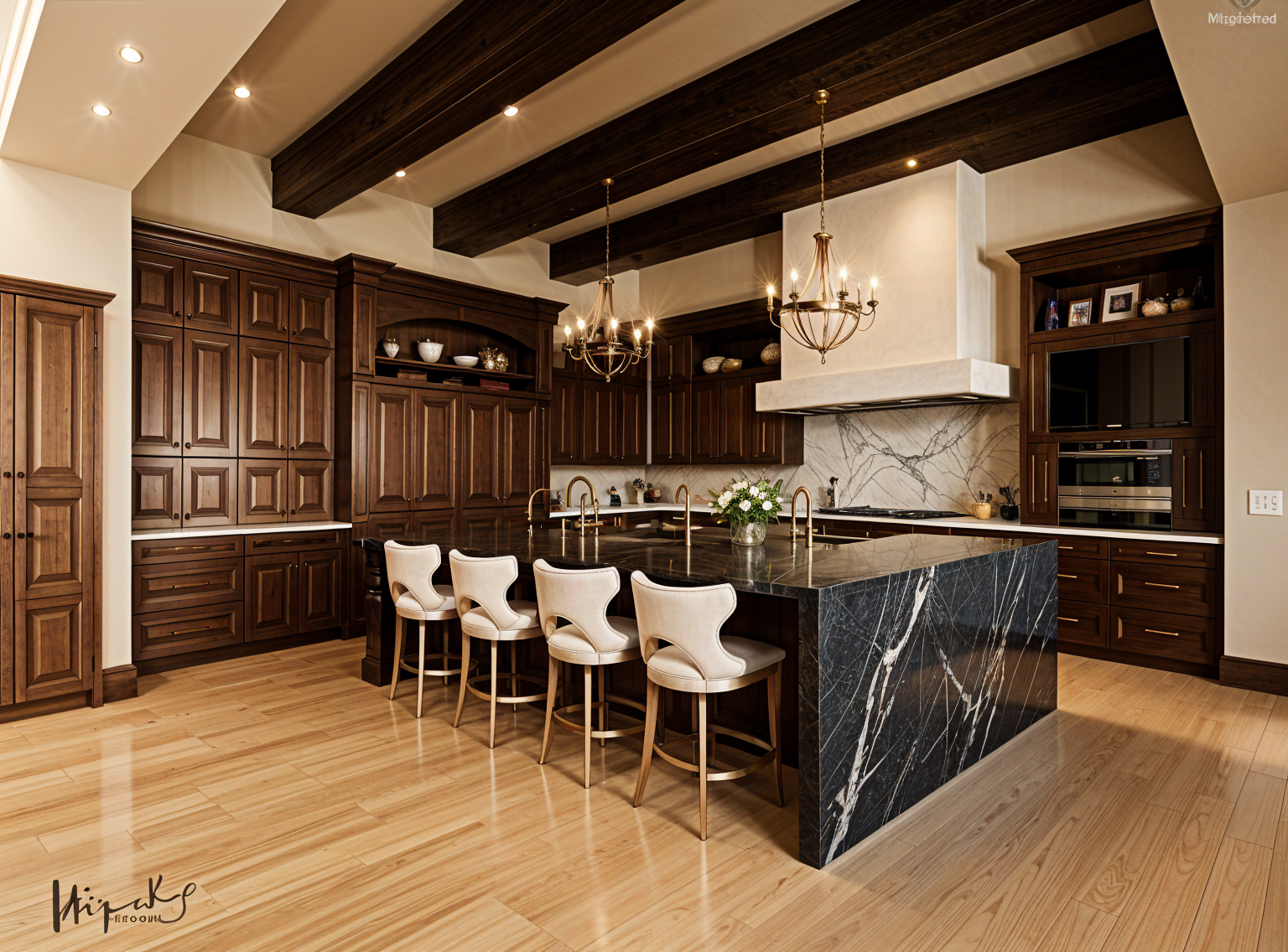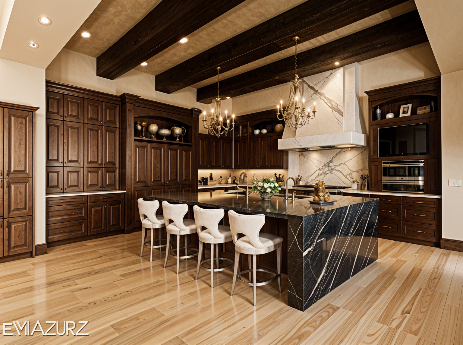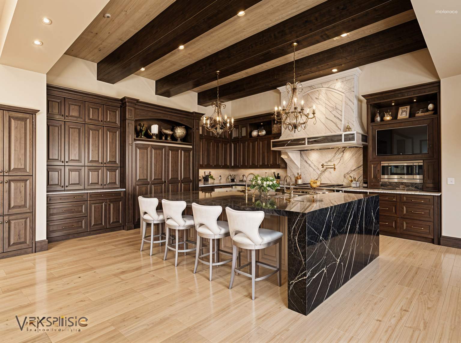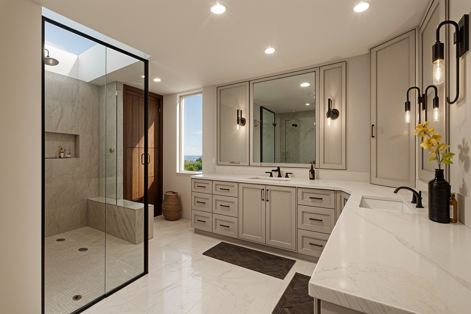 minimalism interior shot a modern luxurious bathroom with a transitional and minimalist design the walls are painted in a soft white tone creating a warm inviting atmosphere the cabinetry is sleek with a light taupe finish and brushed nickel handles the countertops are crafted from white marble with subtle gray veining a spacious walk in shower features sandstone tiles and a clear glass door with black accents the floor is covered with light marble tiles complementing the serene environment black wall sconces provide a soft ambient light a skylight allows natural light to flood in enhancing the bright airy atmosphere add splashes of greenery outside the window for a touch of nature the trim around the light fixtures on the wall is a thin delicate picture frame molding the cabinet style is inset shaker with a classic look the wood cabinets by the window are also shaker style there is a single drain in the middle of the shower and the faucets are elegant but modern architecture