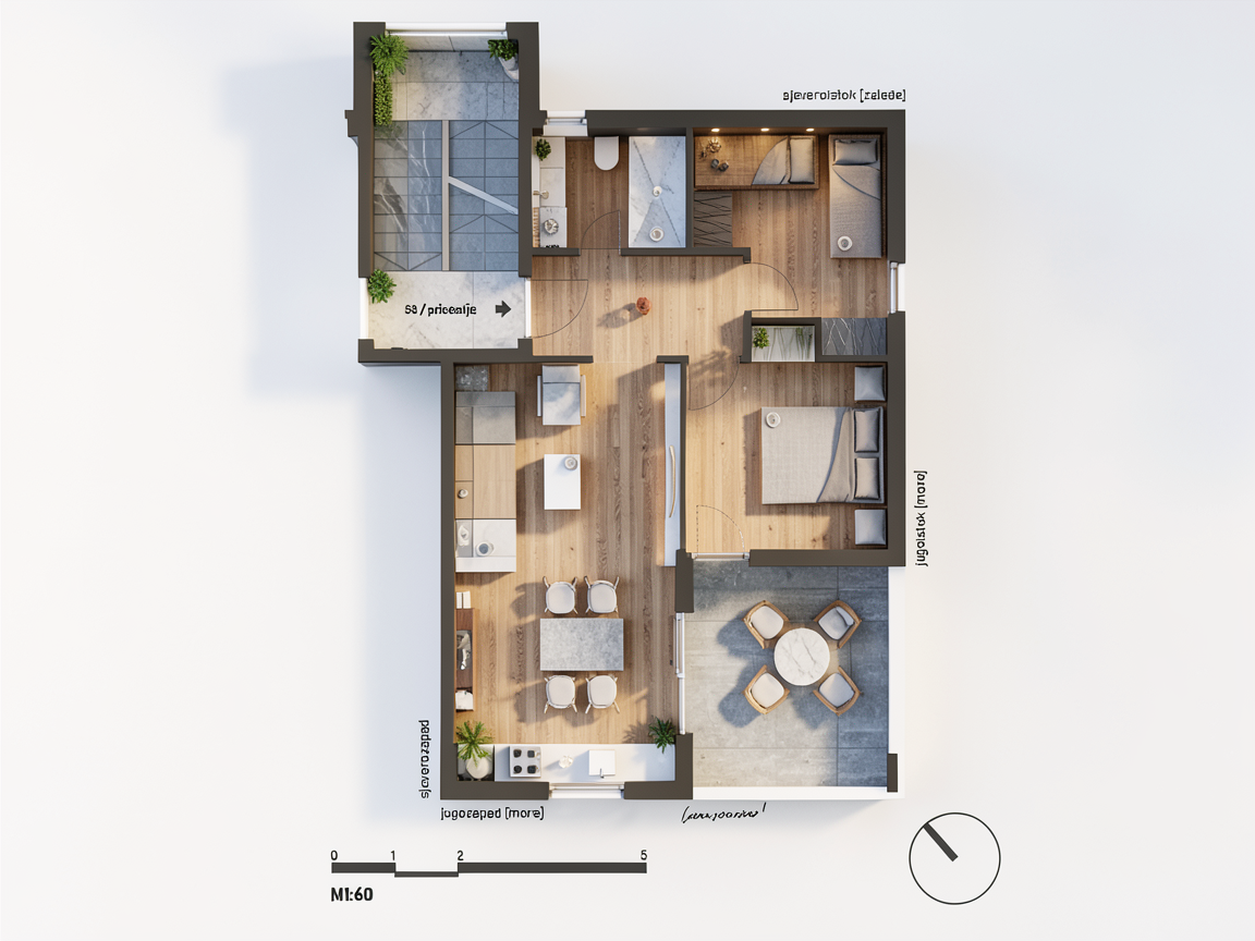 convert this floor plan into a realistic isometric 3d view of a full house show the space from an elevated angle with furniture walls and details visible warm mediterranean style bedroom with en suite bathroom accessed through an existing staircase featuring a cozy and elegant atmosphere warm natural tones refined contemporary mediterranean interiors beige sand terracotta and honey wood palette soft linen fabrics natural materials elegant double bed ambient lighting harmonious and relaxing composition en suite bathroom with sophisticated and refined wall coverings premium finishes elegant textures contemporary design coordinated with the bedroom bright inviting realistic materials high end interior design architectural visualization photorealistic render use the same furniture as shows on the plan do not change the orientation of the floorplan