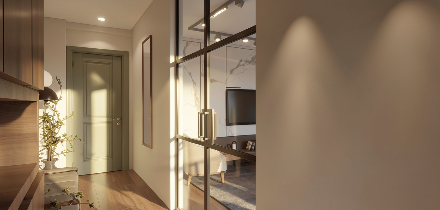 craft a beautifully rendered image of a two story house with a mixture of brick and clapboard design use warm earth tones the bricks should be an aged white and beige color while the clapboard siding is a soft white white trim portray the roof with dark brown shingles window frames are black accent shutters are a light blue green color set the scene in a serene sunny afternoon ambiance with gentle shadows and a clear blue sky providing a tranquil backdrop a light beige paver driveway leads to the front of the home centered on the elevation the front door is a stained oak accent to contrast with the rest of the home