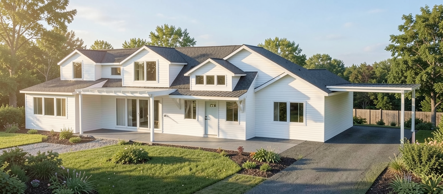make a front elevation photorealistic as possible while keeping textures the same as shown lightly landscaped in a lightly wooded suburb of north carolina nice lighting remove any text use the following finishes bfbdc3 7 lap siding where shown 4f524f 4 lap siding where shown black windows steinhause stack ledge stone black certainteed dimensional shingles with black soffit fascia and gutters back garage doors 8b3636 three panel front door 2d2c2e posts