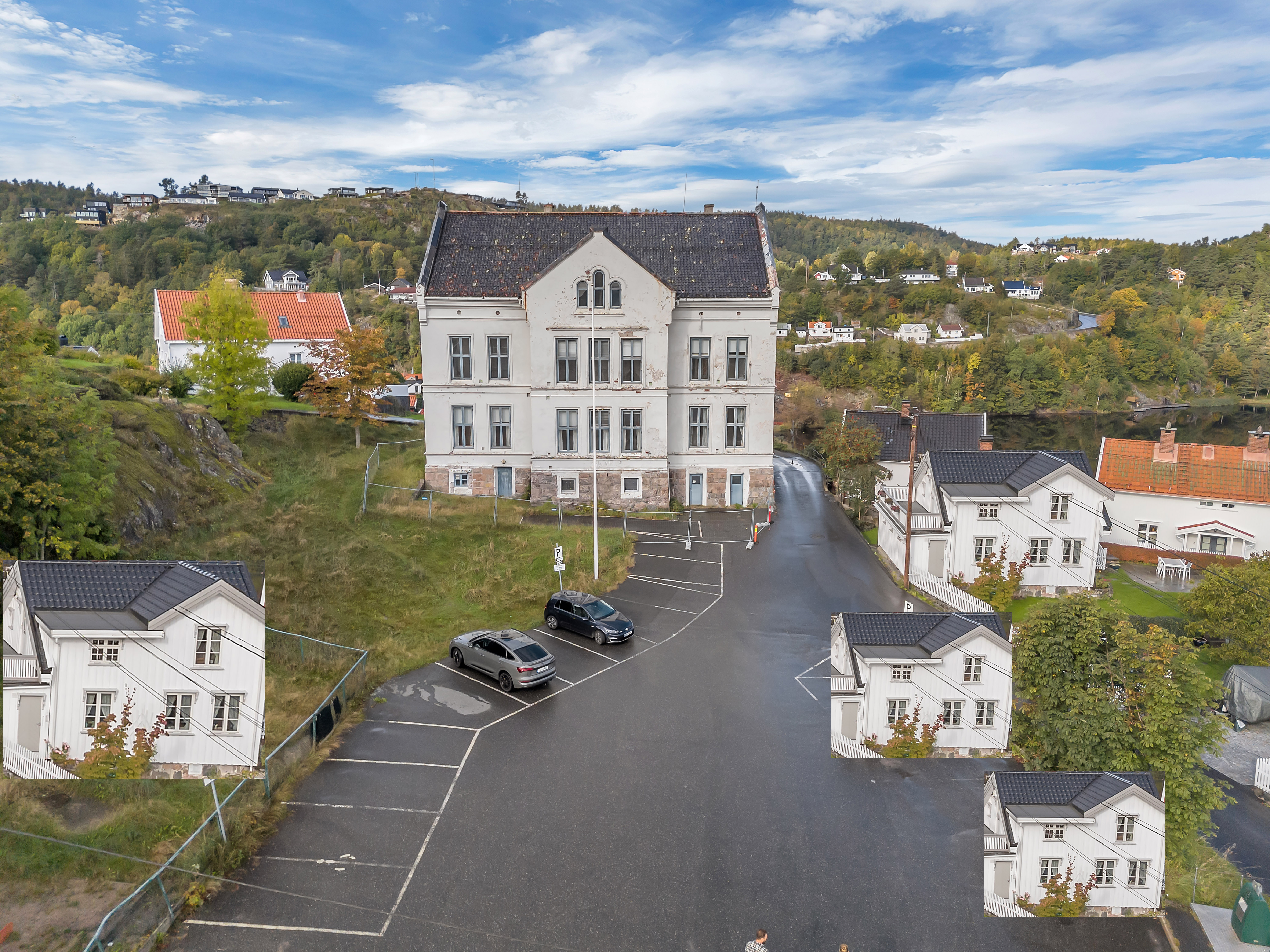 make the school in the middle more realistic the white houses i pasted in should be in modern standard the parking lot in the middle should look nicer