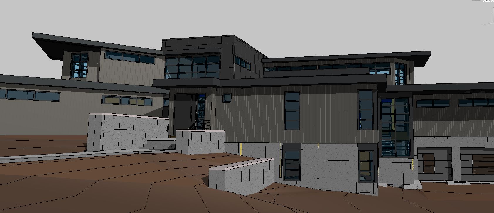 industrial home design matte black metal panels matte vertical shiplap exposed concrete foundations tall grass foreground fog trees in background