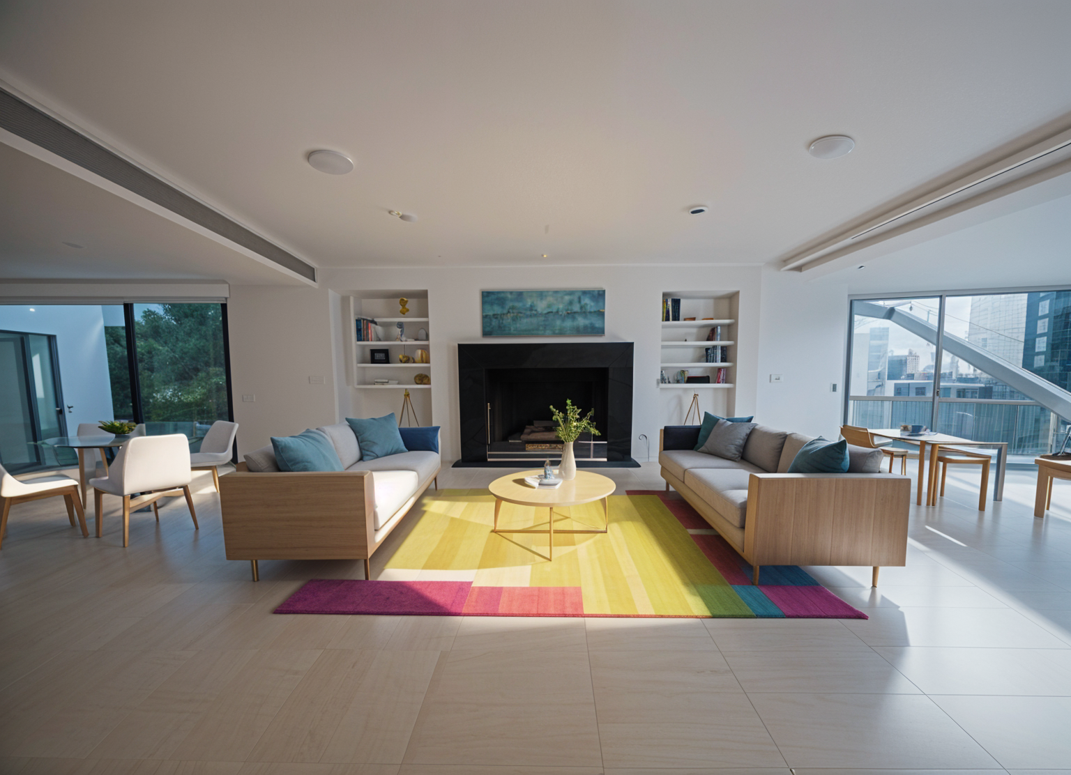 only add modern furniture change nothing else use forest green modern couches and add modern art to the wall surrounding the fireplace