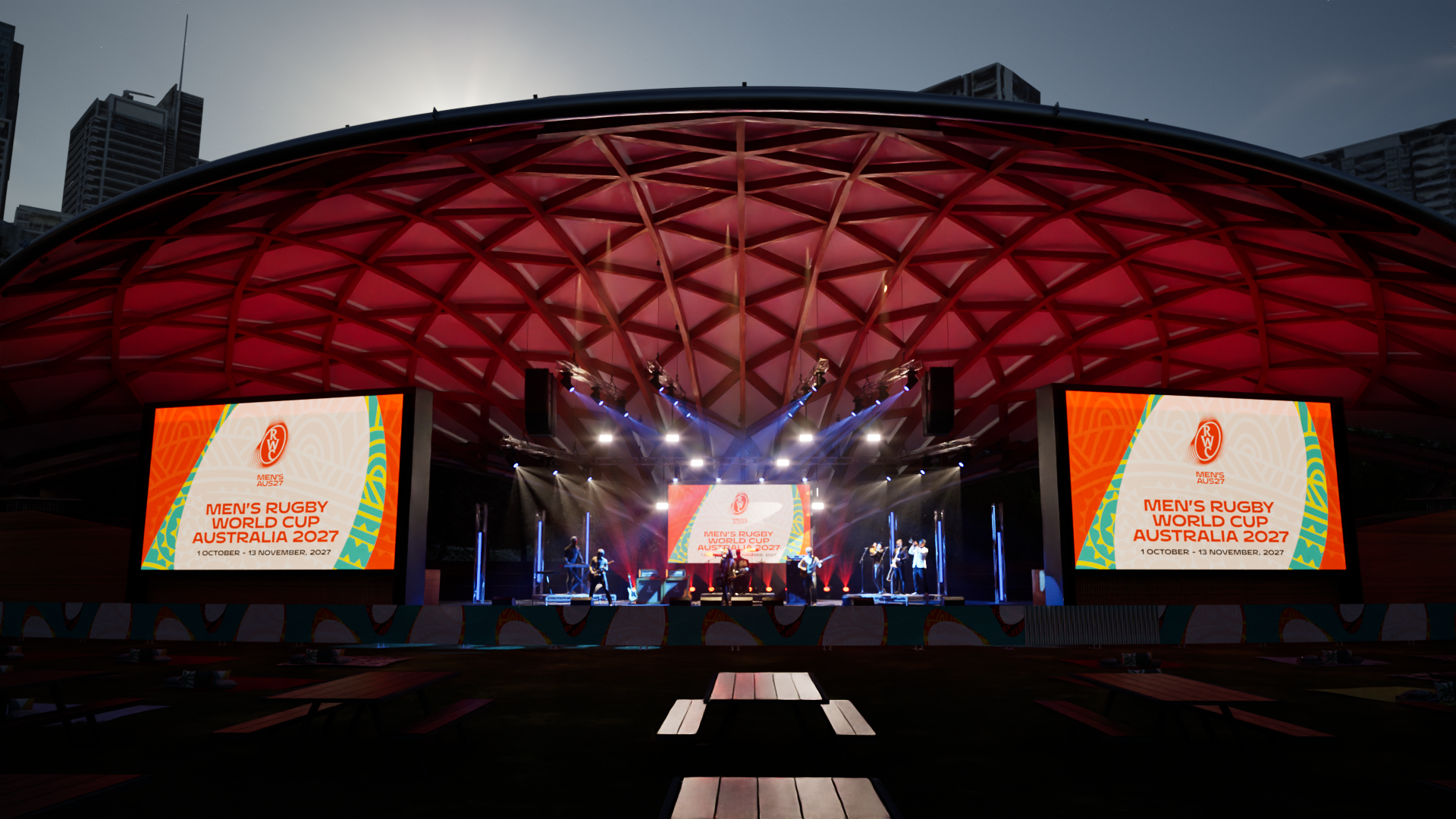 show an audience having fun facing towards the stage