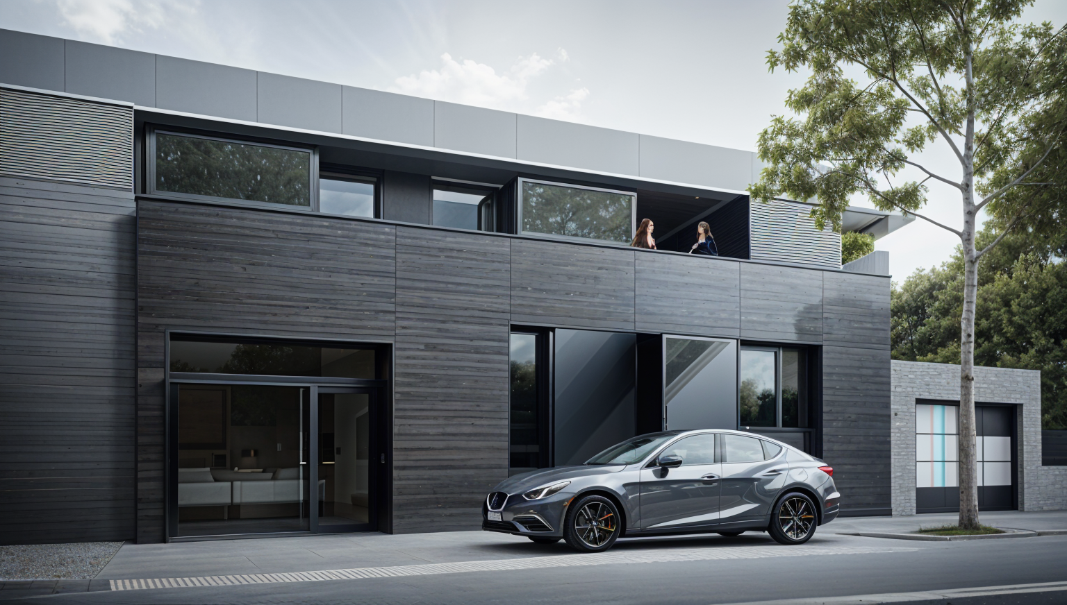 modernist exterior shot modern building with big black windows and wooden facade architecture
