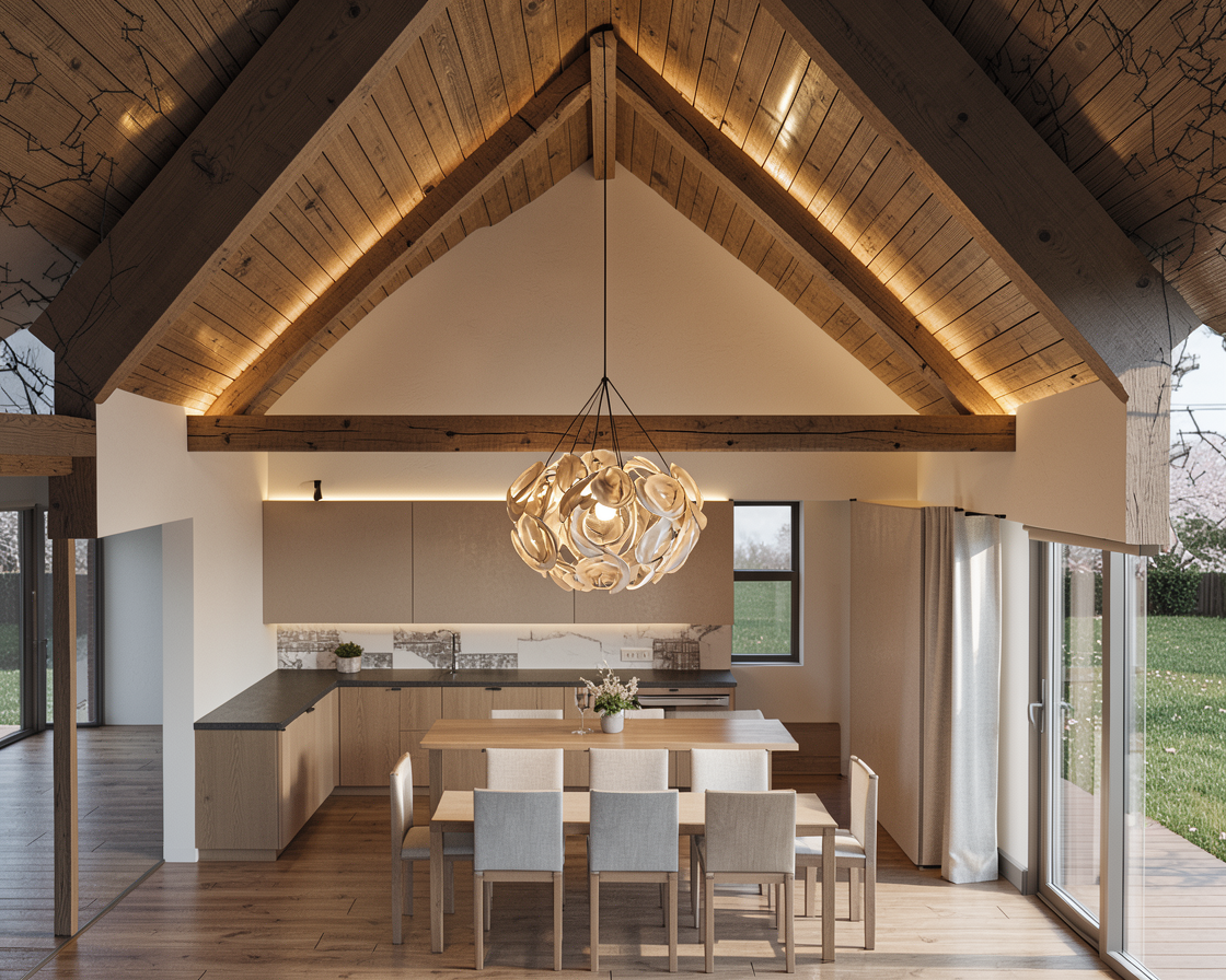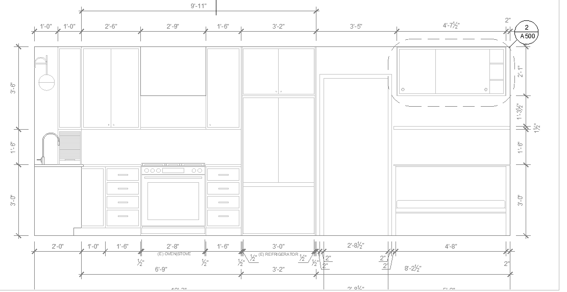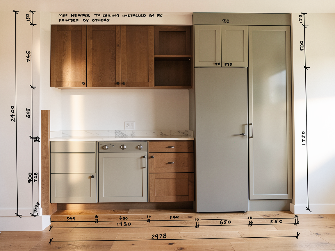 render an interior elevation of the exact midcentury modern kitchen in the interior elevation drawing on a sunny day with warm white walls walnut wood cabinets that go to the ceiling of the standard height room white industrial refrigerator with brass hardware an orange oven a painted plaster simple square vent hood simple brass cabinet hardware a terracotta and cream checkered tile backsplash that goes from the countertop to the base of the cabinets only and has a white stone shelf between the cabinets under the vent hood at the top edge of the tile right of the refrigerator is a darker walnut wood door the built in bench on the right is made of wood to match the cabinets and has vertical tufted cushions in a terracotta colored linen fabric the bench has a brass rail on top there is a wood floating shelf on the wall above the bench at the same height as the stone shelf there is a cabinet of drawers facing the refrigerator behind the bench do not zoom back far enough to see walls beyond the cabinets in the image