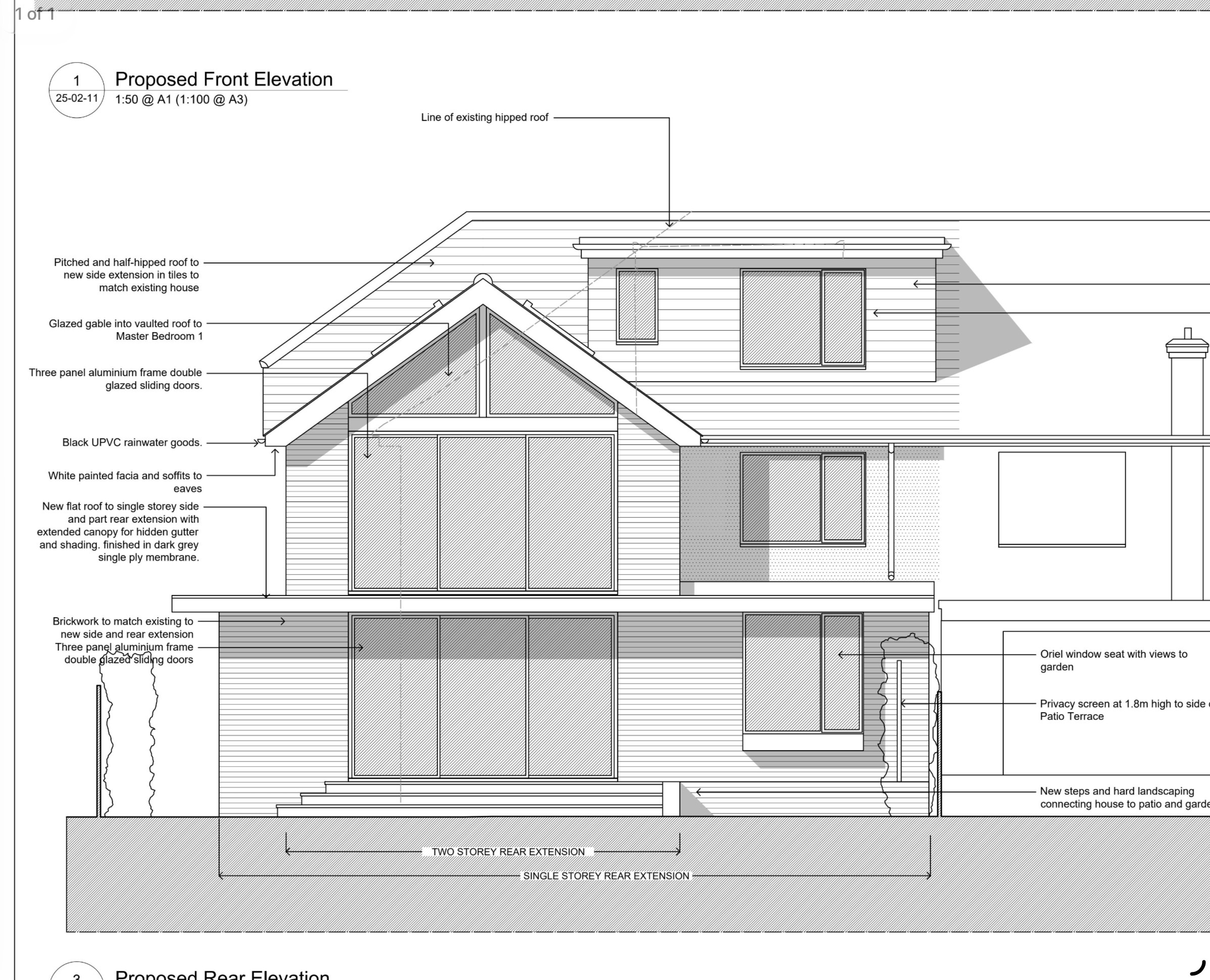 create a rear elevation of this house the brickwork is to use an lbc heather and the roof tiles to be antique brown the glazing is to be black aluminium