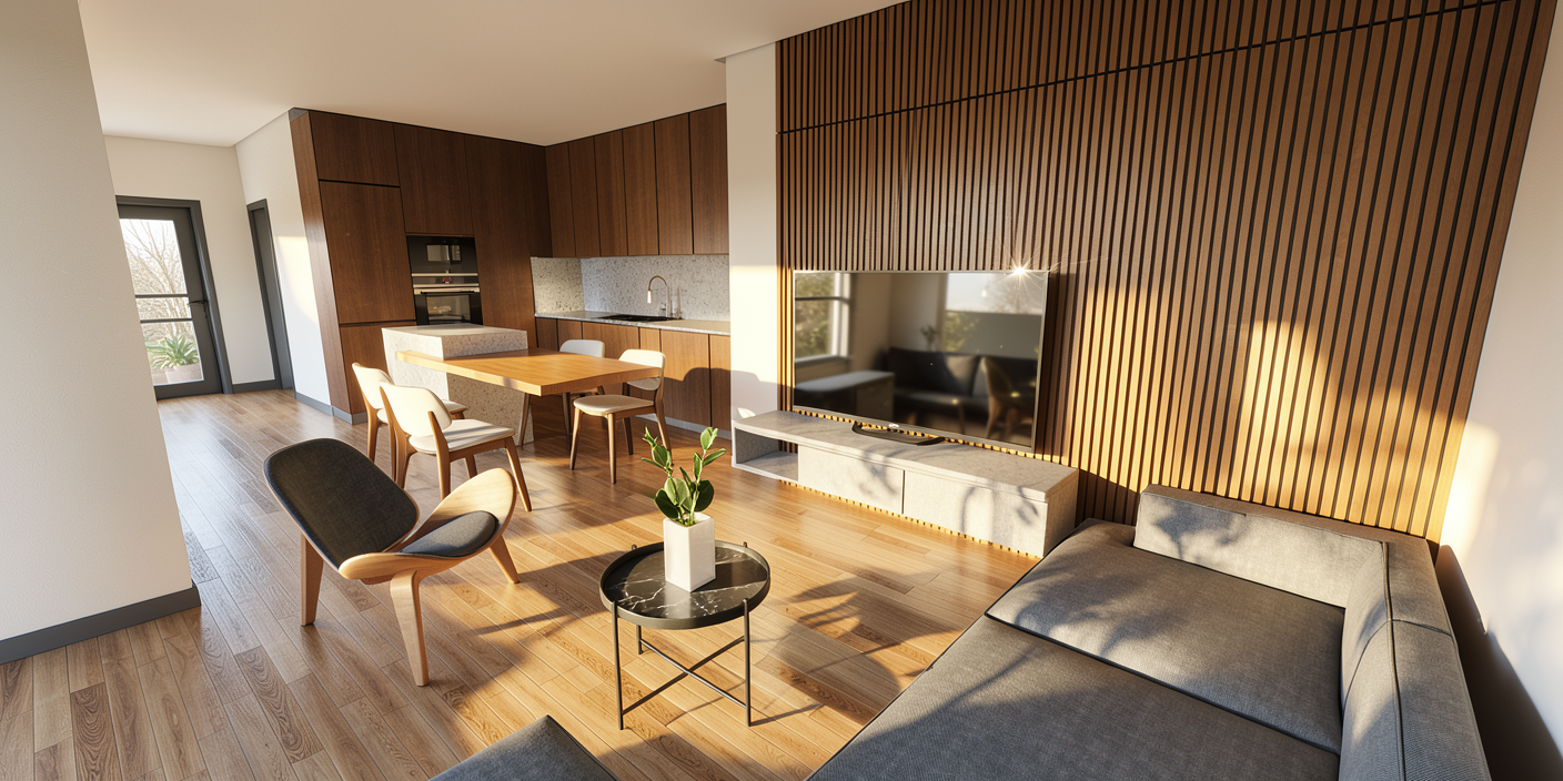 replace all exterior wood with reclaimed vertical plank pine or douglas fir siding warm honey brown tone with subtle amber undertones wood should look naturally aged not new visible knots nail holes mineral streaks and slight gray weathering color variation plank to plank from light tan to deeper caramel brown finish is matte oil no gloss no orange stain no red cedar tone texture is wire brushed reclaimed lumber realistic grain softwood pattern lighting must remain natural and neutral so wood reads warm but not oversaturated do not change architecture geometry proportions camera angle or materials other than wood counter top is black stone
