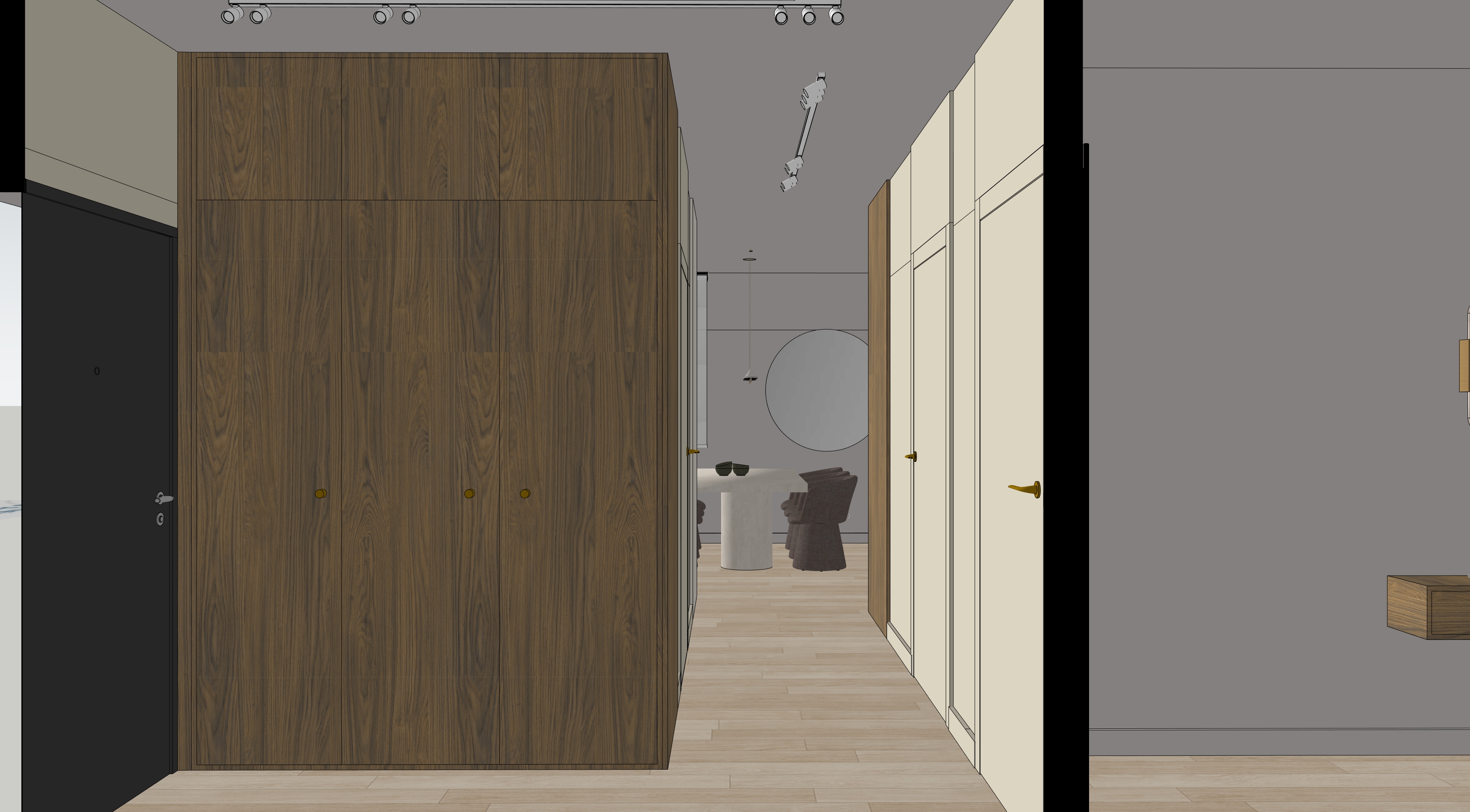 photorealistic architectural visualization of a modern minimalist apartment hallway on the left side a full height built in wardrobe made of natural oak veneer with visible wood grain flat smooth panels small round brushed brass knobs on the right side dark graphite walls with concealed flush doors and elegant brass door handles dark smoked oak wooden flooring matte finish anthracite ceiling with black track lighting and a single adjustable surface mounted spotlight at the end of the hallway a bright dining area visible on axis large round wall mirror light stone dining table with a solid cylindrical base upholstered dining chairs in off white fabric minimalist pendant light centered above the table dining room walls in warm soft white soft natural daylight coming from an unseen window realistic reflections in the mirror physically accurate materials pbr high detail wood texture subtle shadows global illumination realistic contrast natural color grading architectural photography style eye level camera 35mm lens shallow depth of field ultra realistic 8k high dynamic range