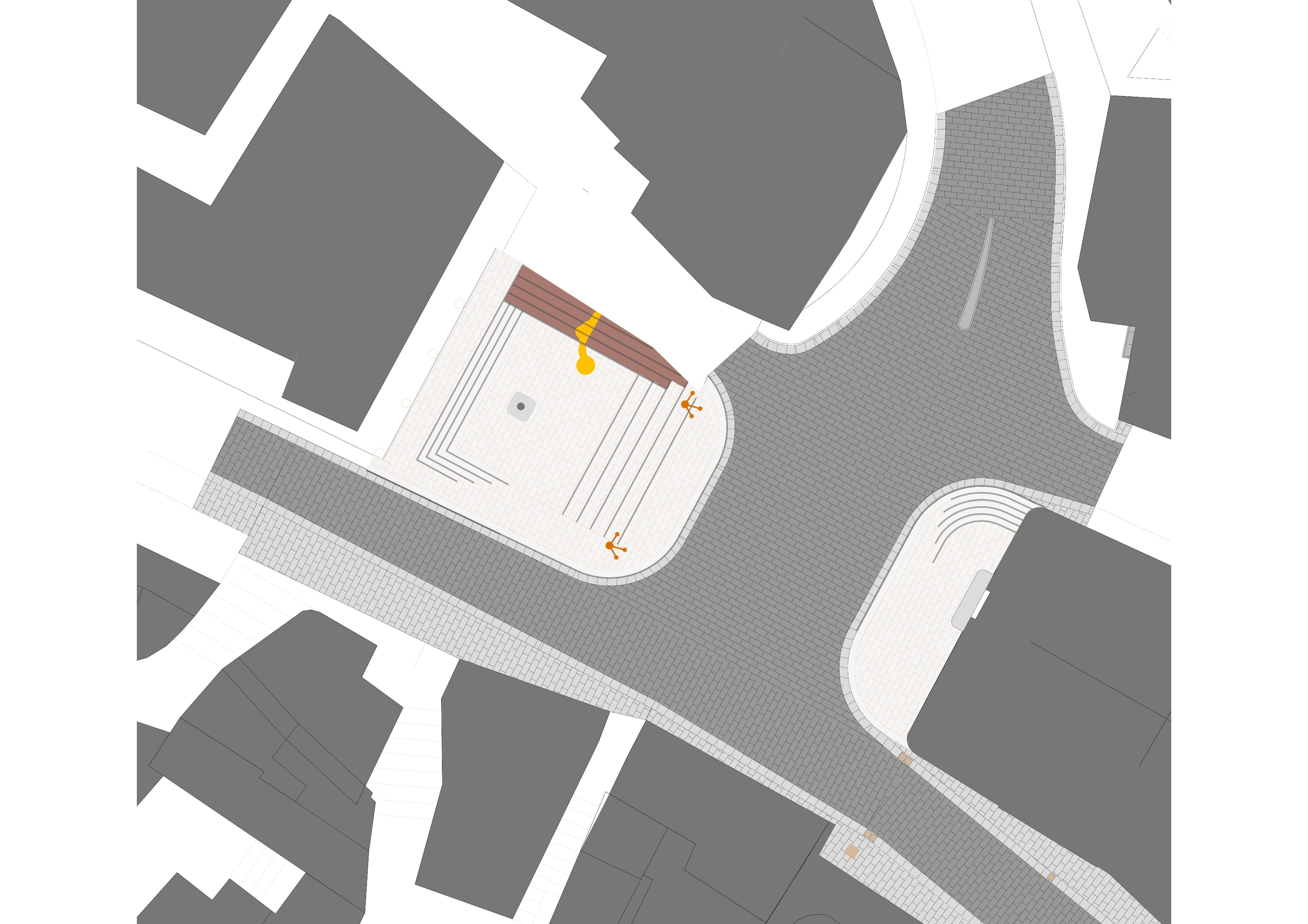sostituisci la superficie grigia con una pavimentazione in pietra lavica con texture naturale leggermente irregolare e finitura opaca sostituisci la superficie bianca con breccia irpina mantenendo una grana materica realistica e tonalit calde e variabili trasforma la superficie marrone in mattoncini faccia a vista con posa regolare e fughe ben visibili