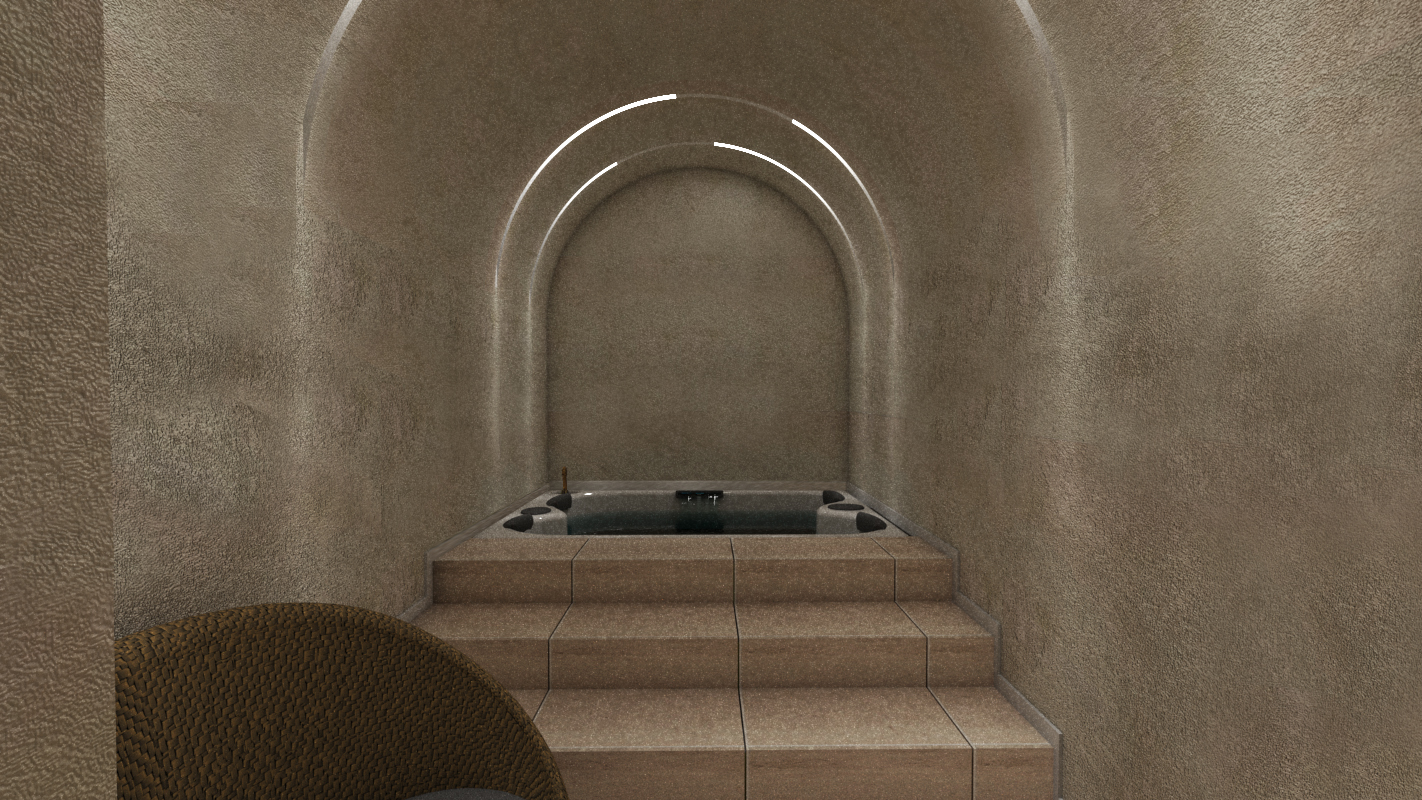 create a luxurious serene indoor spa setting with a cozy inviting atmosphere design a warm toned textured stone archway leading to a plush sunken jacuzzi the jacuzzi area is softly lit with integrated led lights emitting a gentle warm glow the walls of the room display a rich taupe color with a subtle texture evoking tranquility highlight the jacuzzi s calming water in a deep slate blue accent the space with a stylish woven straw chair in shades of muted brown the overall ambiance should evoke relaxation warmth and luxury perfect for unwinding and rejuvenating