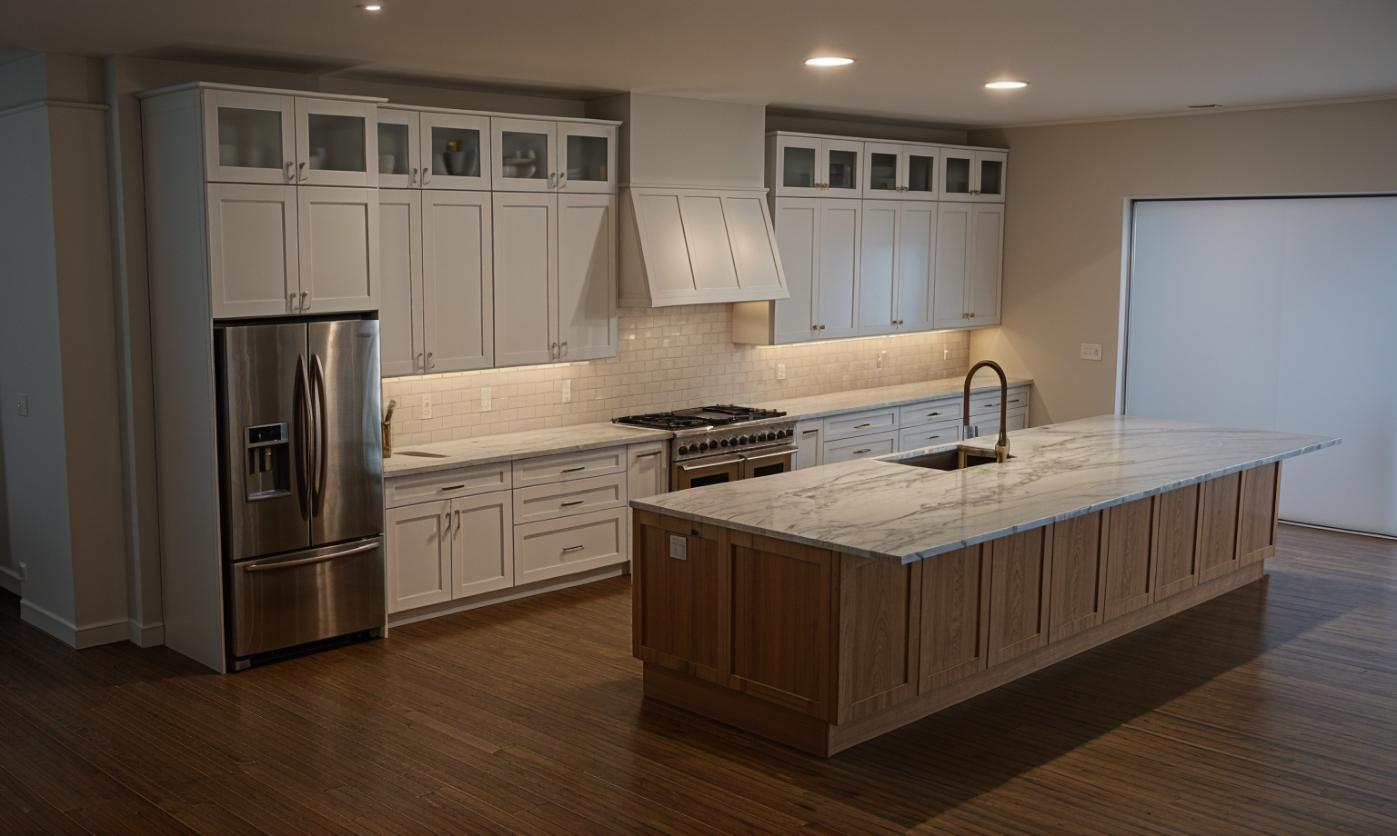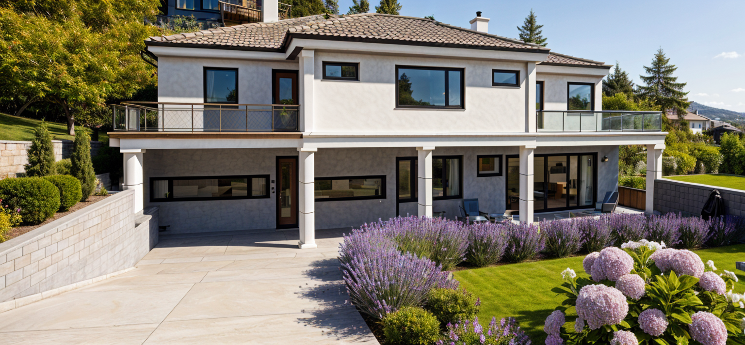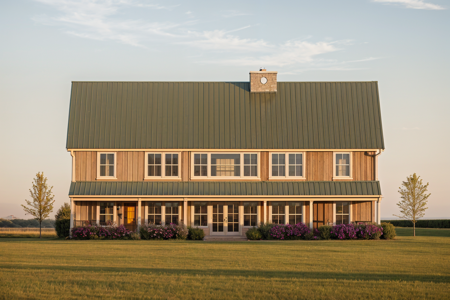 craft a rendering of a barndominium with a modern farm house look render the vertical metal siding in a light brown paint color with white trim around the windows and doors giving a fresh and inviting feel the metal roof and porch roof should be a warm green blending harmoniously with the stone chimney in a light gray add a subtle reflection in large elegant windows create a serene late afternoon atmosphere in an open grass field with golden sunlight cascading over the roof casting long gentle shadows on the house include landscaping adding life and color to the scene