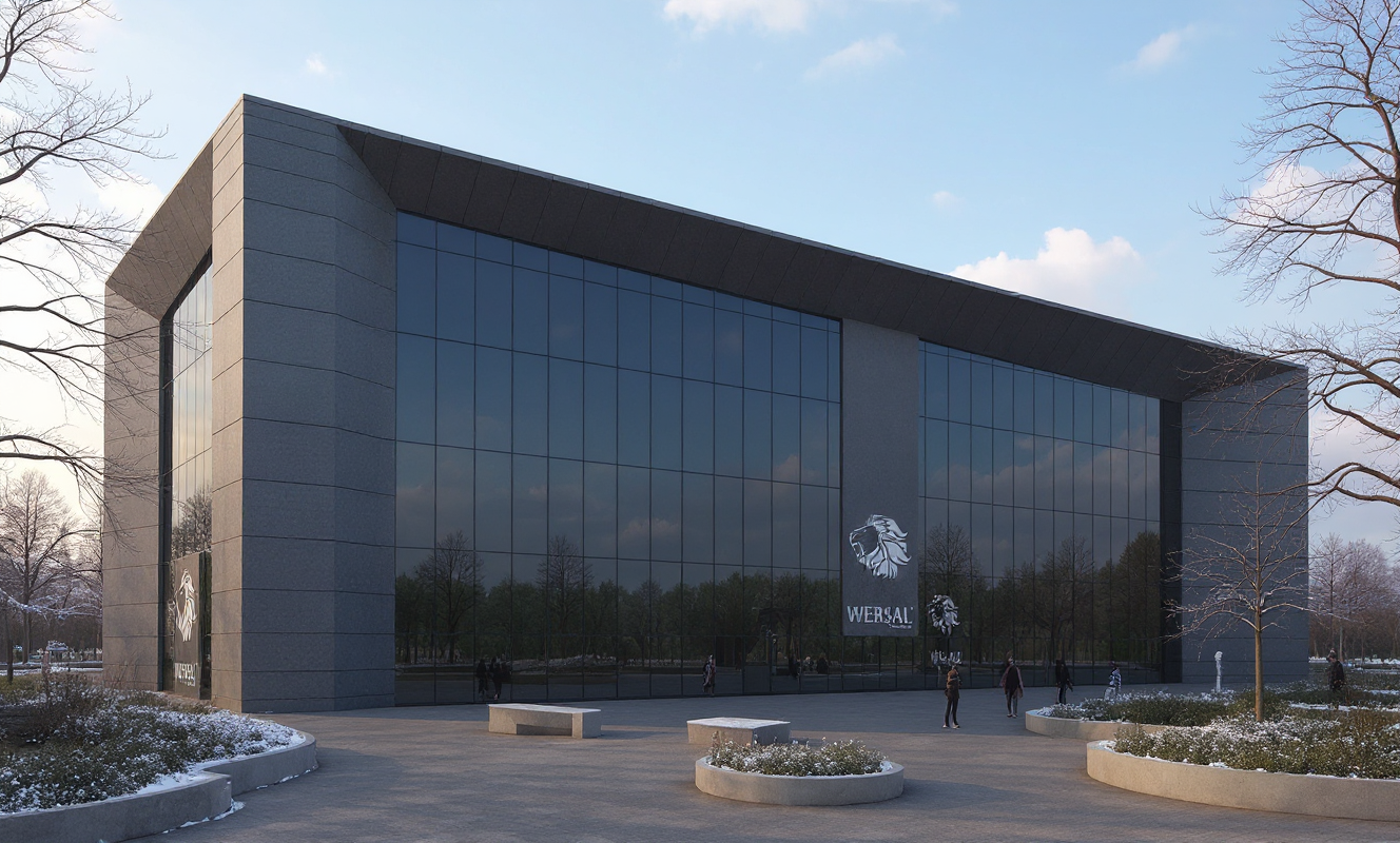 develop the area in front of the office building add concrete benches modern small architecture and decorative low greenery less grass more low ornamental greenery and a few trees modern style architectural concrete add people and ornamental trees winter view add more snow and people summer sunrise do not change the appearance of the building