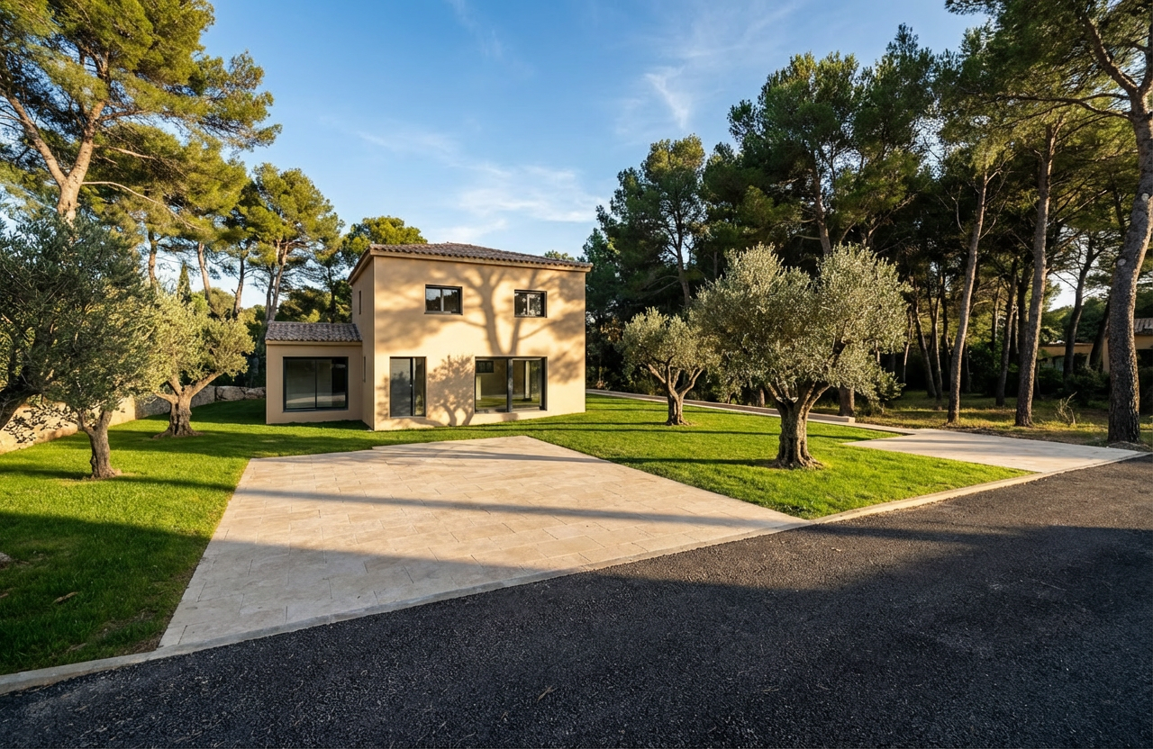 some mediterranean pine trees in the back ground and some olive trees on the grass the facade is color gibraltar from prb and the windows are ral 7016 some tree shadows on the facade the road on the foreground is asphalt the scene is in gignac la nerthe in south of france