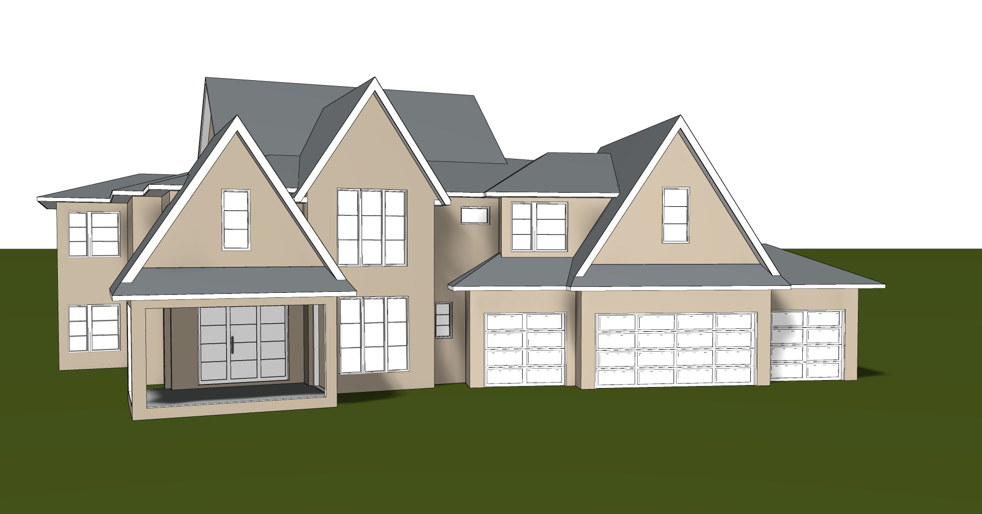 photorealistic exterior rendering of a contemporary prairie style single family residence based on the provided massing and roof geometry exterior materials include smooth warm light greige stucco horizontal natural cedar siding used selectively at gable infill panels recessed entry walls and second story accent volumes dark vertical siding in a charcoal or near black fiber cement or metal panel on select tower and secondary volumes and light gray limestone veneer at base walls and garage columns dark vertical siding is used sparingly to emphasize height and break up massing balanced against lighter materials to avoid over darkening wood siding shows subtle grain and natural color variation not oversaturated roofs finished with architectural asphalt shingles in a medium to dark charcoal tone with realistic shingle scale staggered courses ridge caps and subtle surface variation metal limited to drip edge fascia flashing and accent elements in a dark bronze or charcoal finish a thin metal canopy installed above the vertical tower window grouping expressed as a shallow folded steel plate with crisp edges finished in dark bronze or charcoal metal slender steel tie rods extend diagonally back to the fa ade with visible mounting plates casting soft shadows black aluminum window frames with accurate mullion proportions and lightly reflective glazing interior lights on at low to moderate intensity warm 2700 3000k visible but not glowing twilight blue hour lighting conditions with a cool luminous sky providing soft ambient fill balanced exposure with lifted shadows and preserved highlights avoiding crushed blacks subtle contrast between cool sky light and warm architectural lighting global illumination enabled with natural bounce from lawn stone and concrete surfaces exterior lighting limited to recessed soffit lights entry lighting and gentle wall washing at stone and vertical siding elements warm light restrained and directional not overpowering the scene concrete driveway with realistic roughness and tonal variation simple believable landscaping with lawn low shrubs and stone edging camera at eye level 35 45mm equivalent lens straight on elevation with slight perspective realistic residential architectural visualization physically based materials ray traced lighting no stylization no cinematic effects