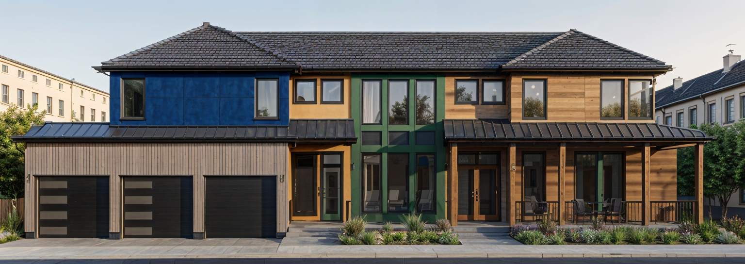 black windows horizontal dark wood off white stucco