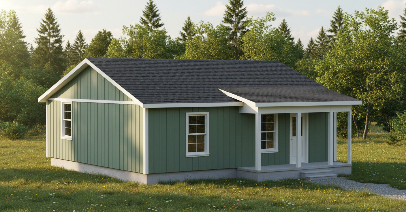 its a house with grey vertical siding and a black metal roof the foundation wall around the house and the porch has dark stone the posts and beams on the porch are dark wood color add light fixtures to the porch wall the house sits on a grass lot with a sunset and trees in the background add a big stone path from the middle of the porch